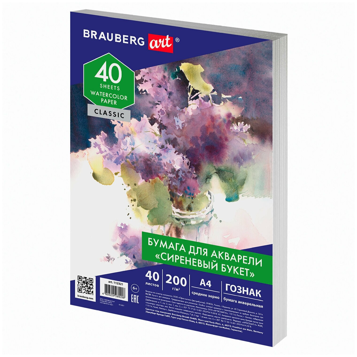 Бумага для акварели, гуаши / акварельная бумага художественная для рисования А4, 200 г/м2, 40 л., гознак СПб, в коробке, BRAUBERG ART, Сиреневый Букет, среднее зерно, 112321 информация: