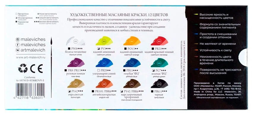 Малевичъ Набор масляных красок, 12 цветов по 12 мл информация: