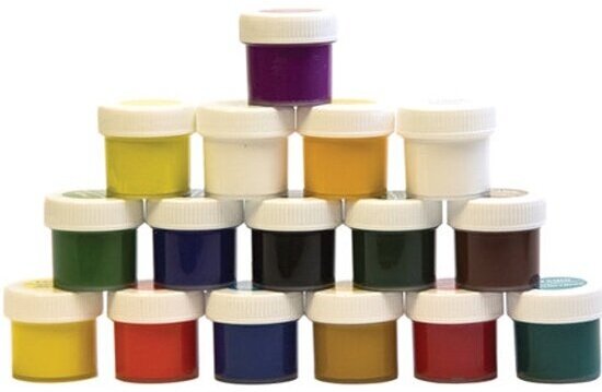 | Дополнительная информация | общий объем - 320 мл; упаковка - картонная коробка; размер упаковки: 160x160x38 мм; 16 цветов: белила, охра, сиреневый, синий светлый, желтый темный, алый, голубой темный, желтый светлый, рубиновый, изумрудный, коричневый, лимонный, зеленый светлый, зеленый темный, черный |