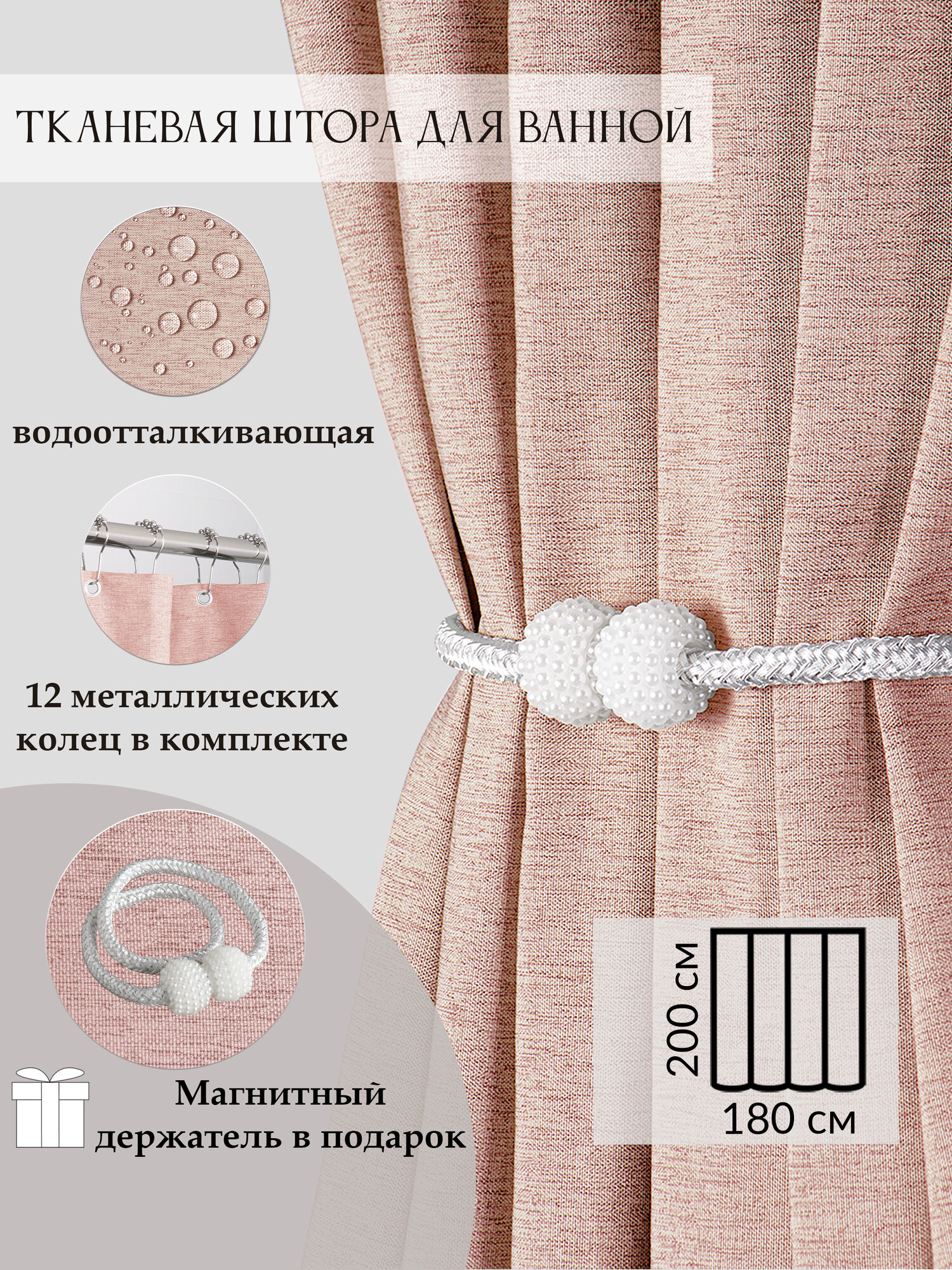 Штора для ванной тканевая плотная LEN 180х200 см полиэстер / текстура лён / розовая занавеска для душа информация: