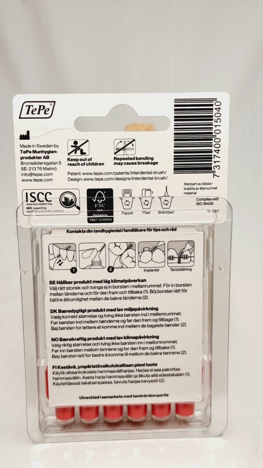 | Способ применения | Аккуратно введите ершик в межзубное пространство и проведите вперед-назад несколько раз. Можно с использованием геля для зубов TePe Gingival Gel. Ополосните ершик после использования. Никогда не проталкивайте ершик между зубами с силой, он должен входить мягко, в противном случае следует выбрать меньший размер. Для лучшего проникновения между жевательными зубами согните гибкий конус у основания стержня. |