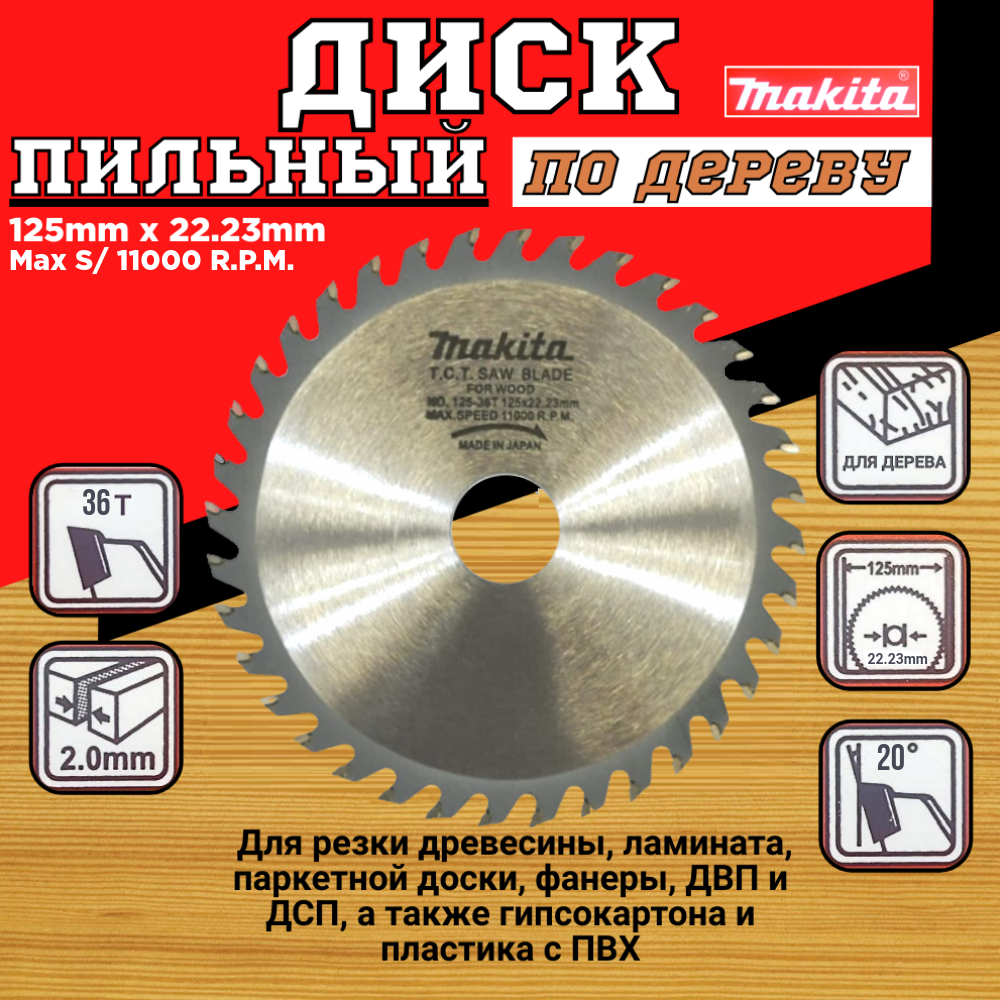 Диск пильный по дереву/ламинату/ДСП/гипсокартон/пластик/ для УШМ 125х36Тх22.23мм Makita информация: