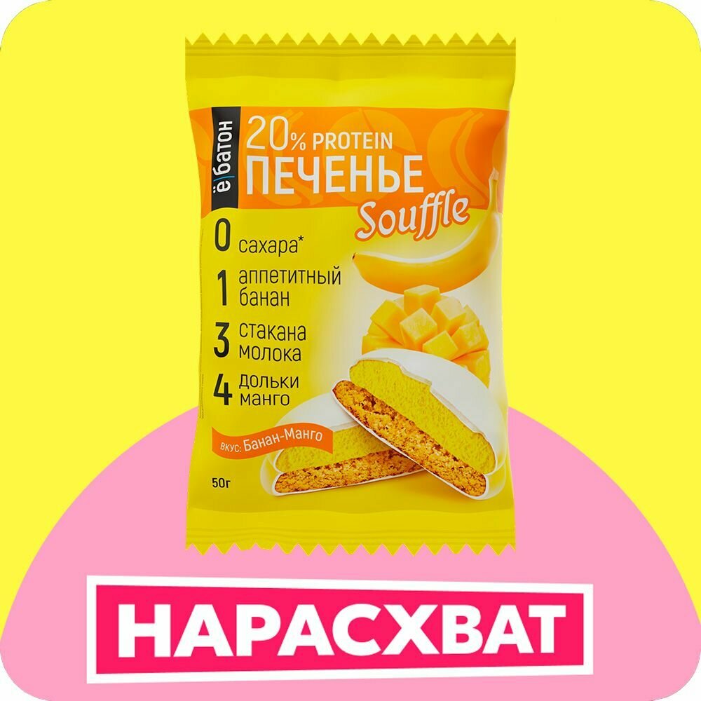Протеиновое печенье ё/батон с белковым суфле 20% белка, манго-банан, 4 шт по 50 г