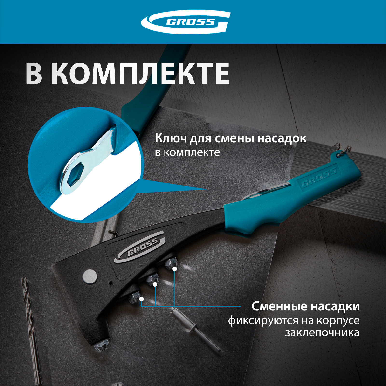 | Подробная комплектация | Заклёпочник - 1 шт; насадки - 1 шт; ключ - 1 шт |