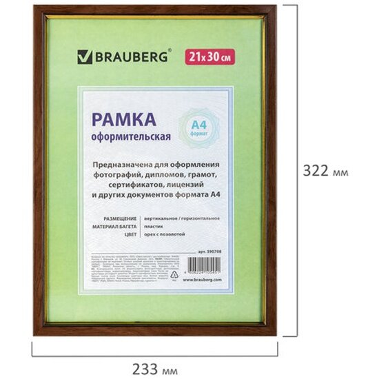 Рамка оформительская Brauberg 21*30 см, пластик, багет 15 мм, HIT, орех с позолотой, стекло (390708)