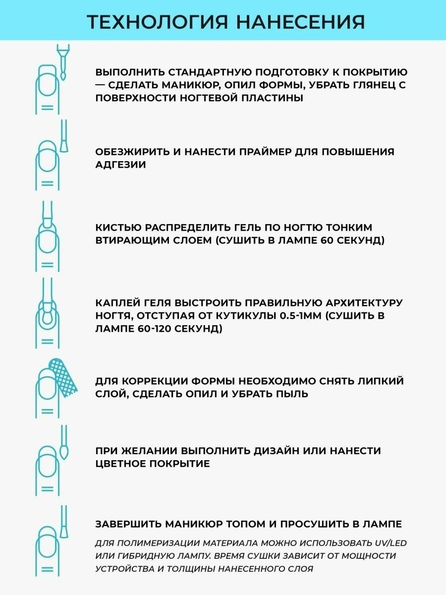 | Способ применения | База: нанести на подготовленный ноготь тонким слоем втирающими движениями. Сушить 30-60 секунд. Моделирование: выкладывать мягкими движениями, не давить на кисть, по технике выравнивания гель-лаком. При необходимости перевернуть палец и дать гелю распределиться. Сушить 60-90 секунд. При работе в технике без опила рекомендуется после полимеризации скульптуры подпилить торцы, открыв немного толщины. Финиш: наносить тонким слоем мягкой кистью. Сушить не меньше двух минут. Дать гелю остыть, затем снимать дисперсию. Для получения более интенсивного глянца рекомендуется перекрывать гель топом. |