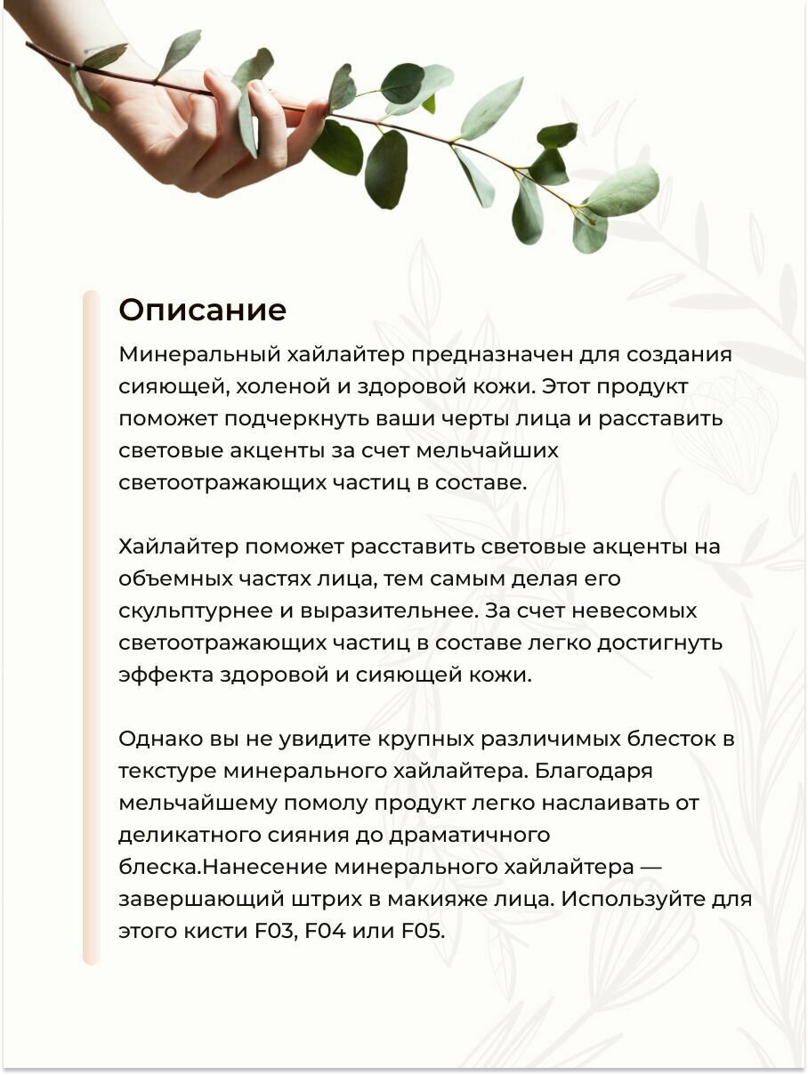 | Дополнительная информация | Баночка рассыпчатого хайлайтера оснащена сифтером — поворотным замком, блокирующим случайное просыпание и попадание бактерий извне в продукт. Поверните сифтер наполовину или полностью, чтобы высыпать нужное количество продукта в крышку. Наберите хайлайтер на кисть круговыми движениями и удалите излишки с ворса легкими постукиваниями по основанию кисти. После этого можно приступить к нанесению. |