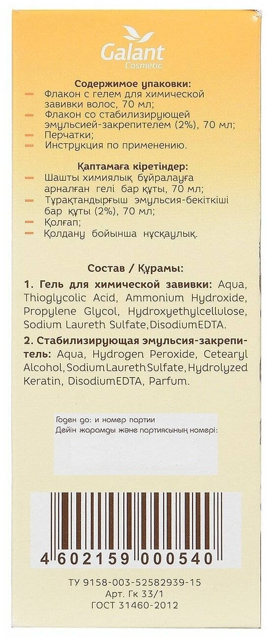 | Состав набора | гель для химической завивки (70 мл), стабилизирующая эмульсия-закрепитель 2% (70 мл) |