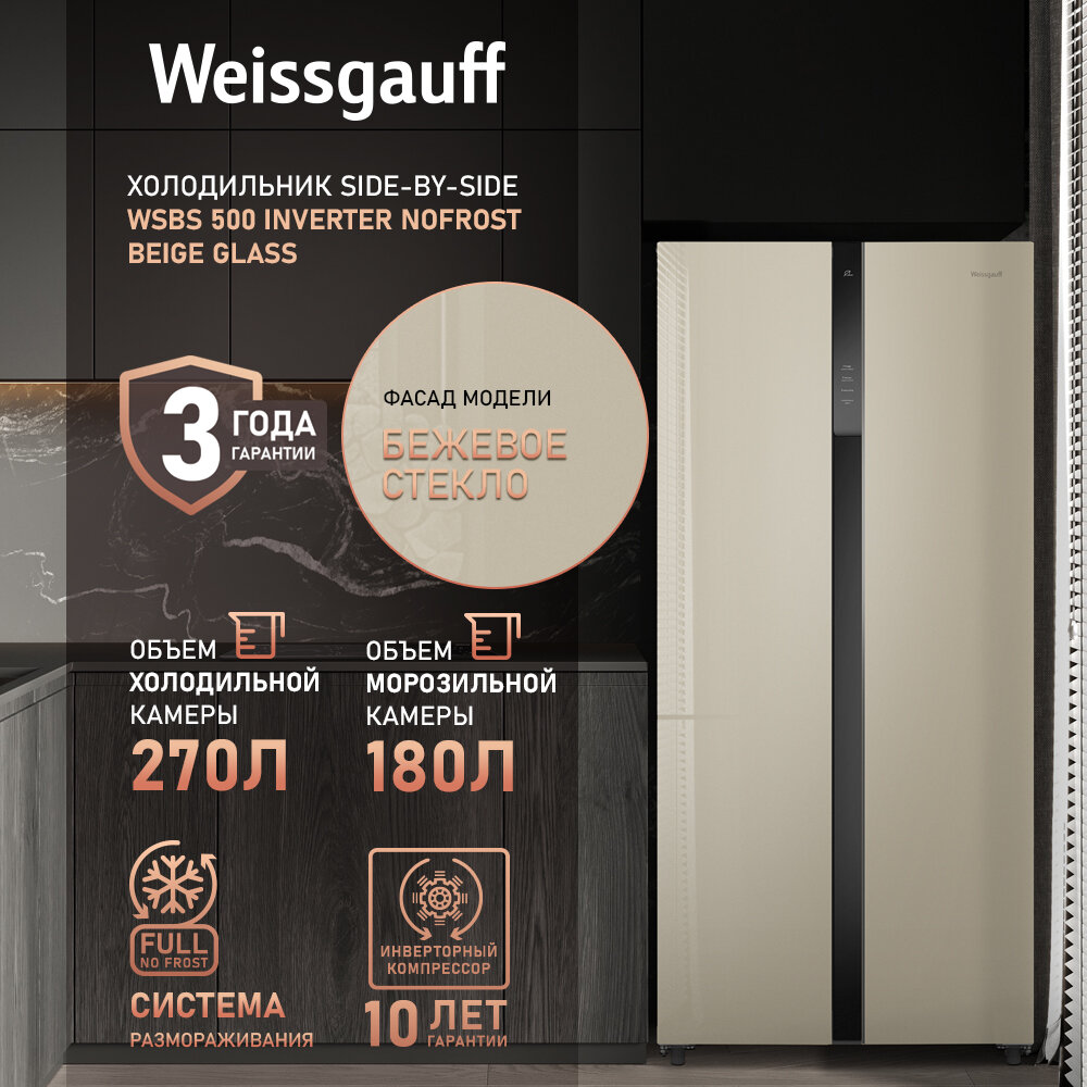 10 цен на Отдельностоящий холодильник с инвертором Weissgauff WSBS 500 Inverter NoFrost Beige Glass