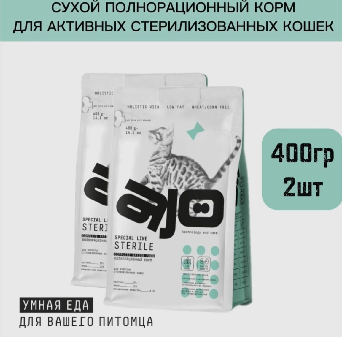 10 цен на Сухой корм AJO (АЙО) Cat Sterile для активных стерилизованных кошек с высоким содержанием белка 400г*2шт
