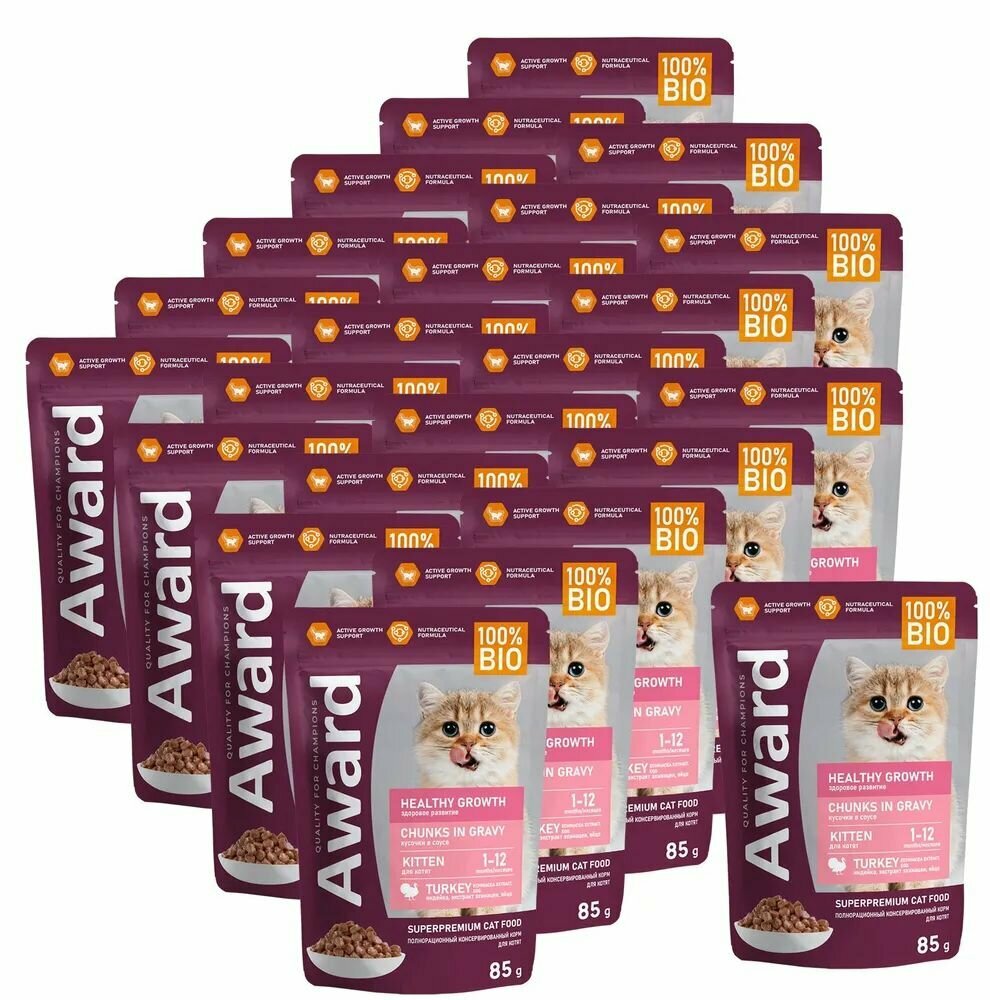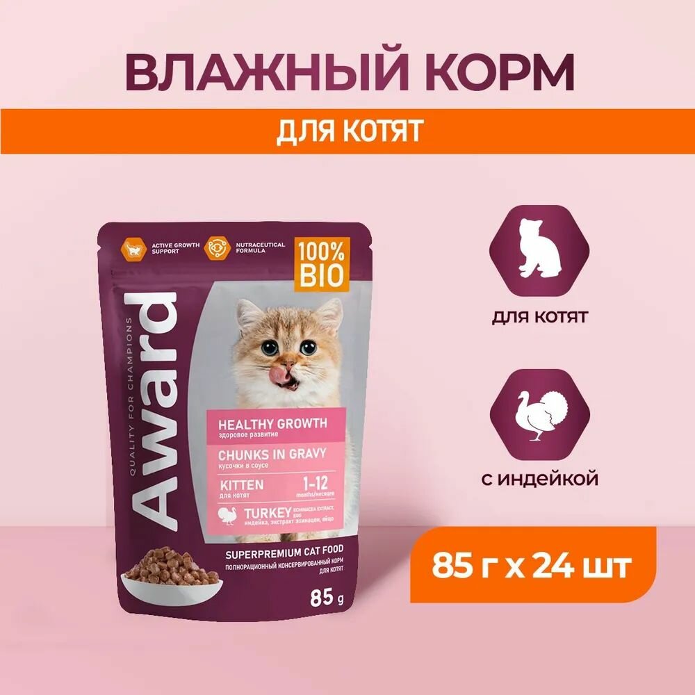 Влажный корм AWARD Healthy growth для котят от 1 месяца кусочки в соусе с индейкой 85г 24шт информация: