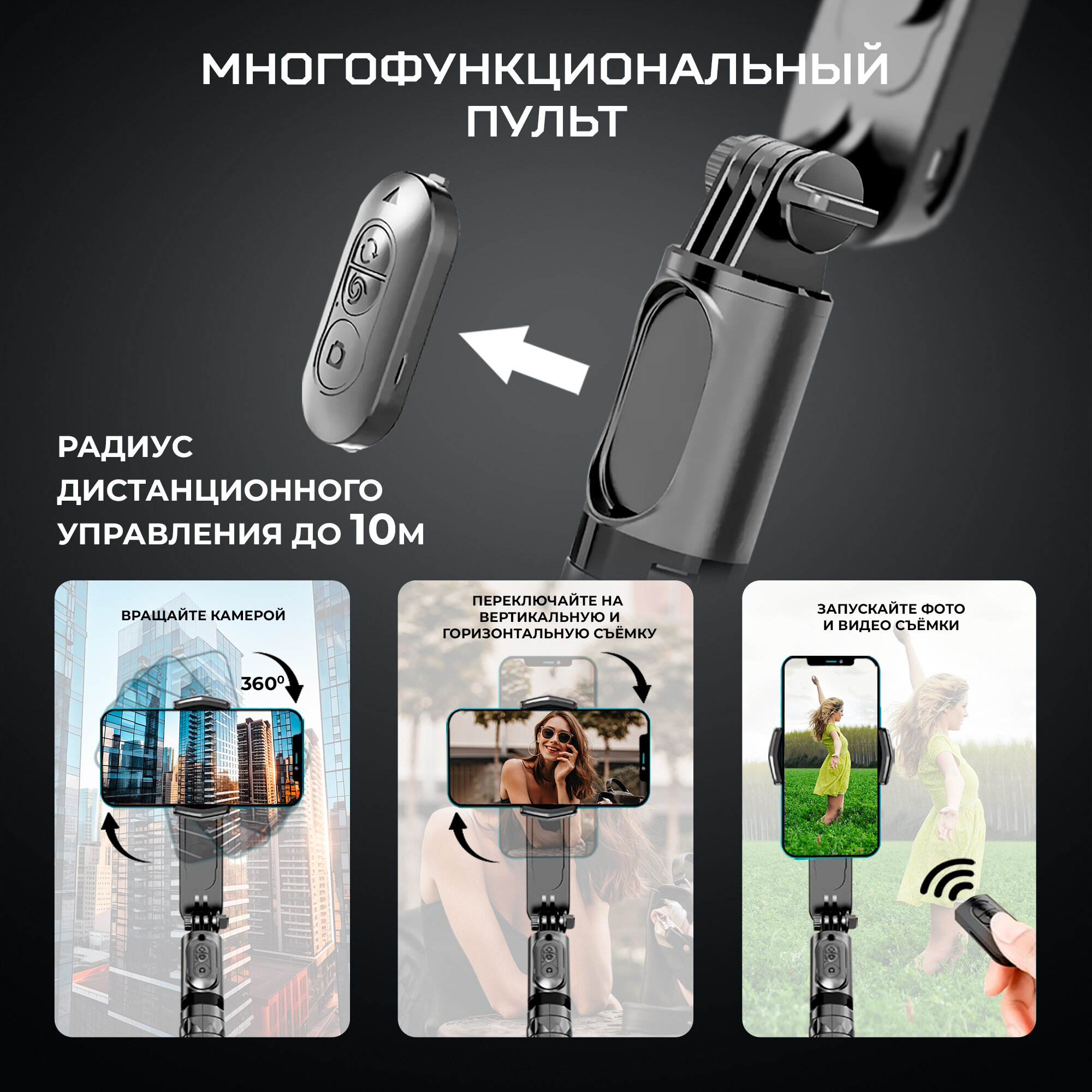 | Особенности | Bluetooth, аккумулятор, настройка баланса, пульт ДУ, с поворотом, съемка в вертикальном формате, удлинительная штанга |