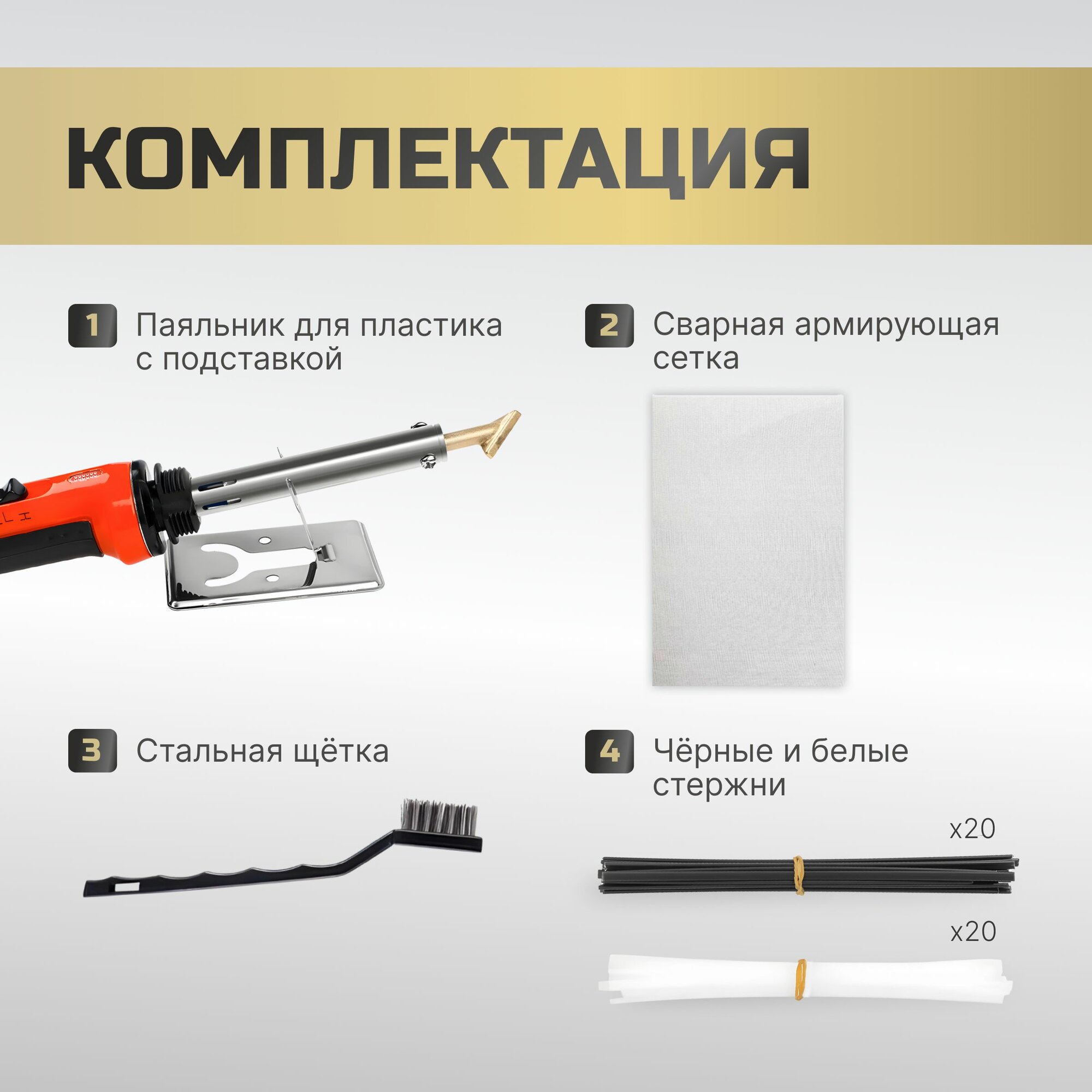 | Комплектация | Паяльник для пластика - 1 шт., скобы для пайки - 200 шт., кейс для хранения - 1 шт., инструкция - 1 шт. |