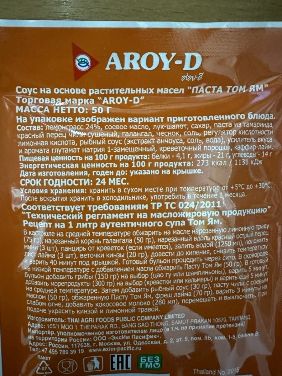 Aroy-D Паста Том Ям, 50 г, 3 шт информация: