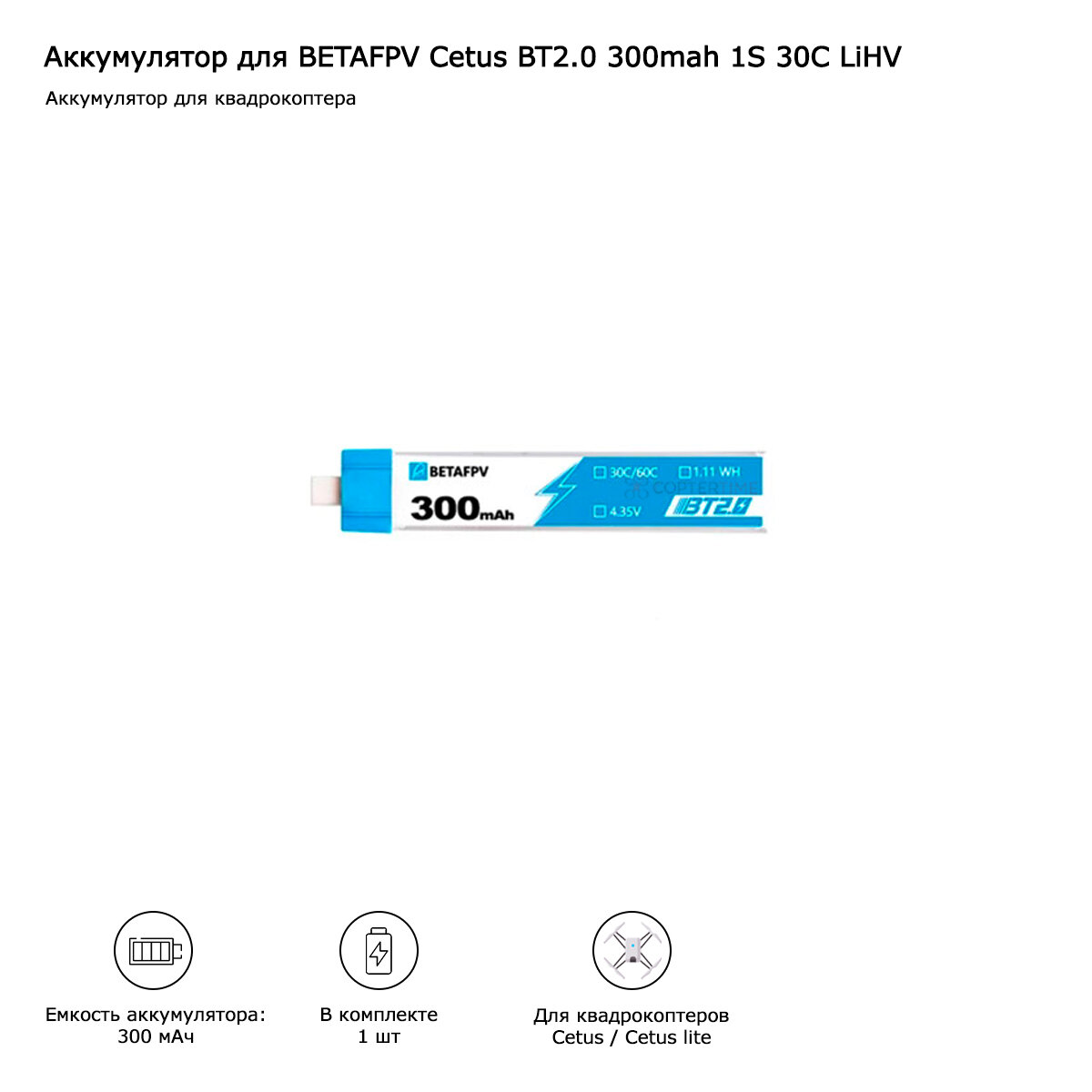 | Комплектация | Аккумулятор для BETAFPV Cetus BT2.0 300mah 1S 30C LiHV - 1 шт |