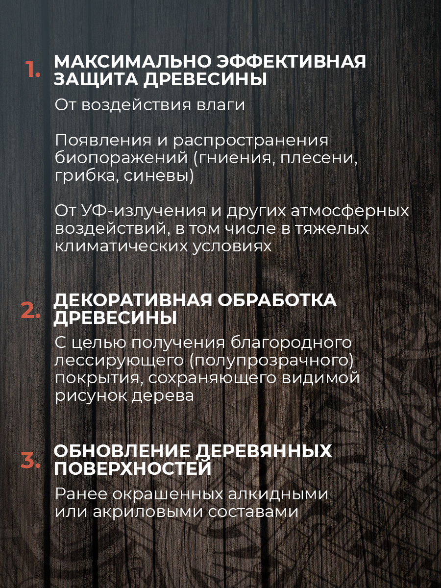| Особенности | УФ-защита, без запаха, быстросохнущая, водозащитная, декоративная, морозостойкая, отбеливающая, с антисептиком |