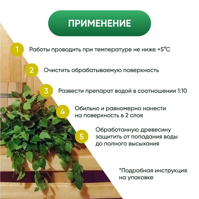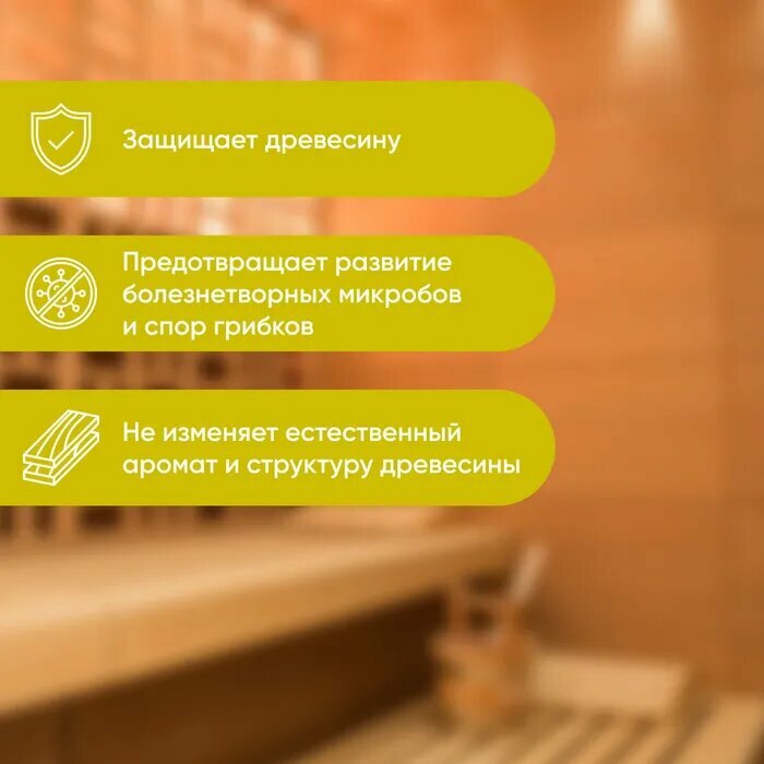 | Особенности | без запаха, для использования в бане/сауне, невымываемая, с антисептиком |