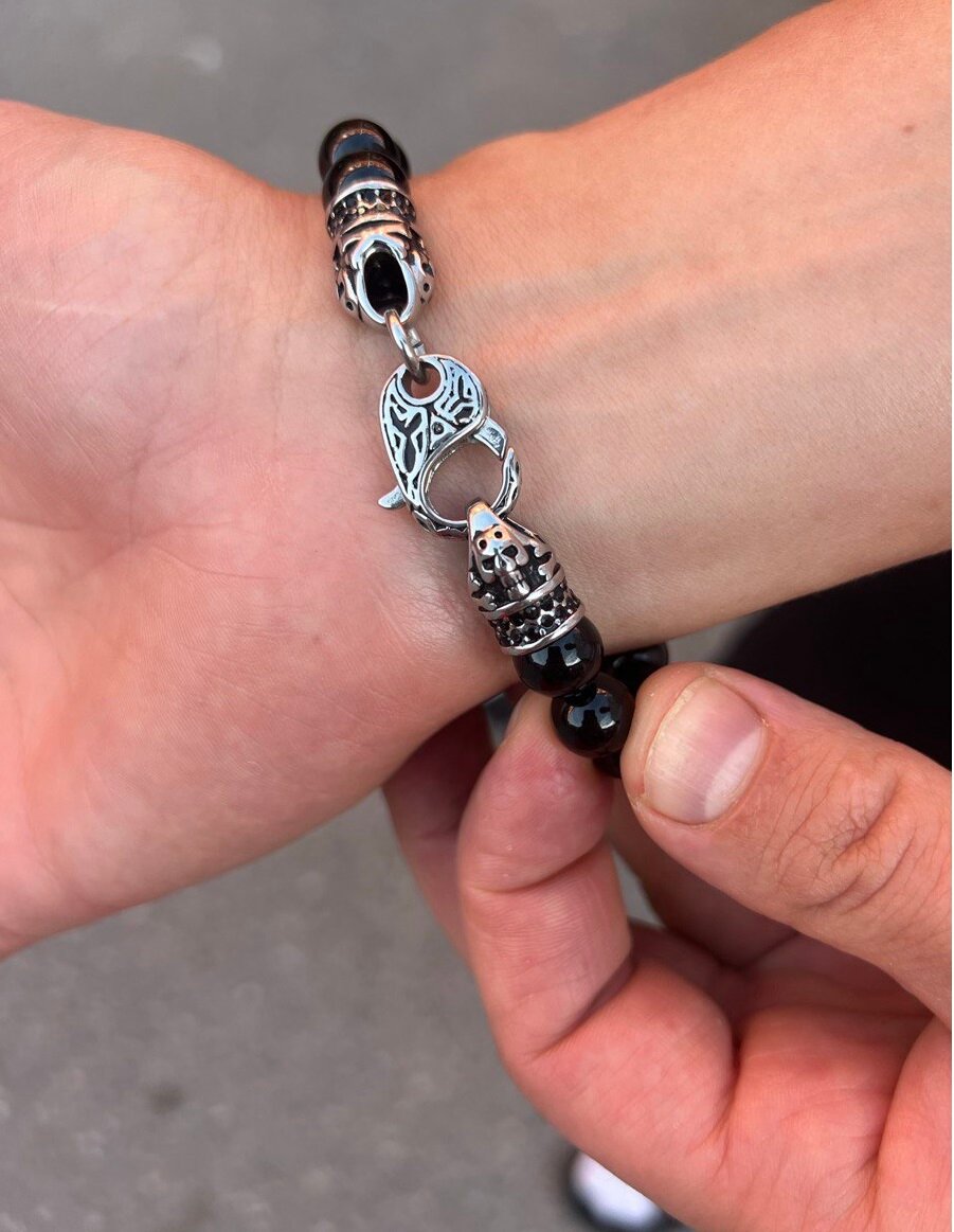 10 цен на Браслет из чёрного агата и стали с бусинами 10 мм/ 21,5 см