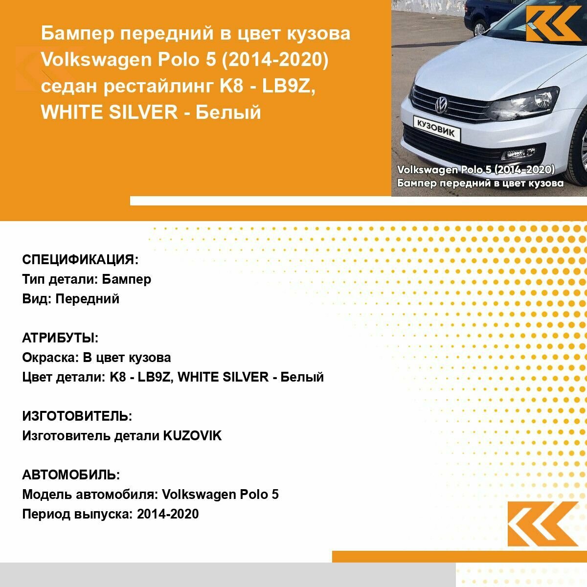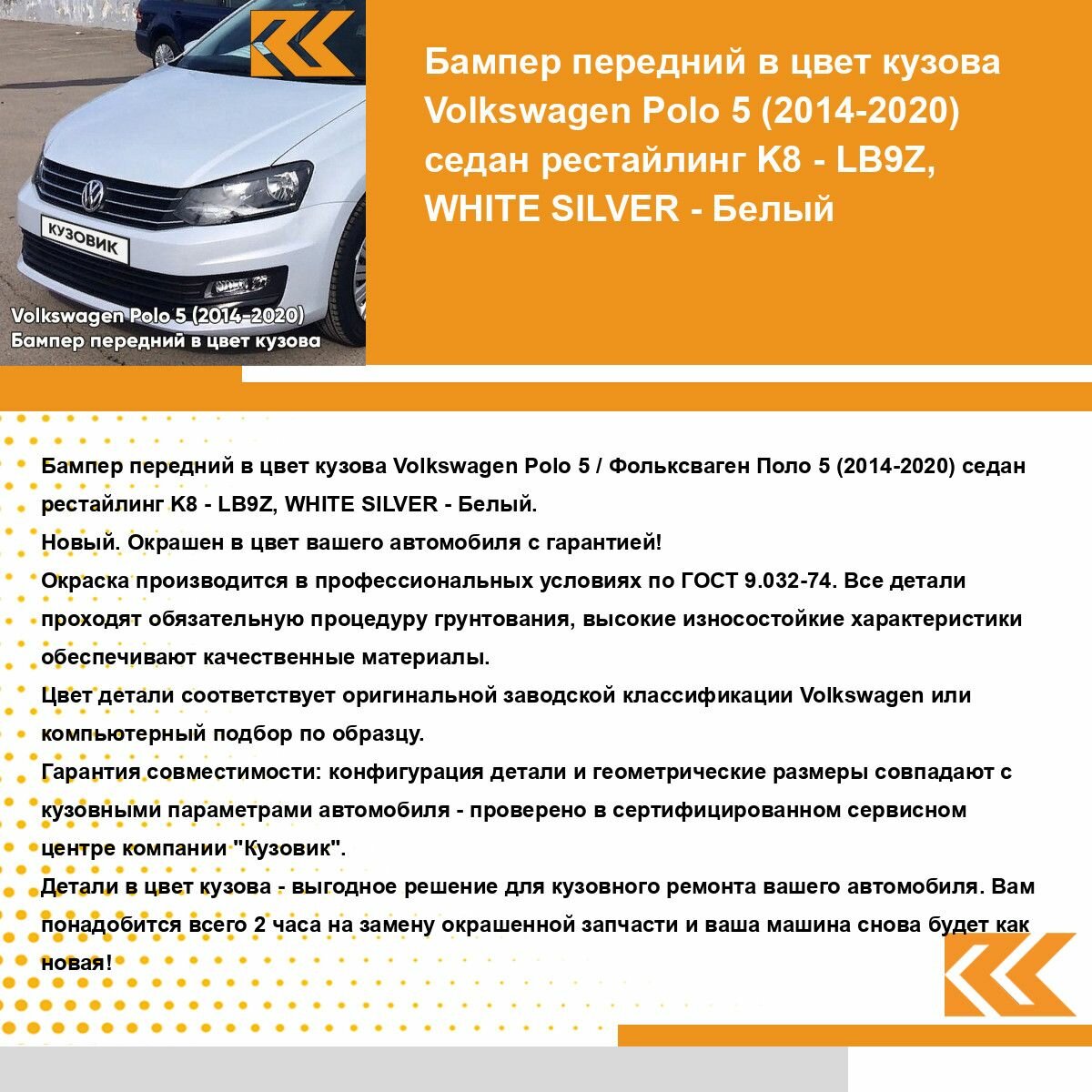 Отзывы на Бампер передний в цвет кузова для Фольксваген Поло 5 Volkswagen Polo 5 (2014-2020) седан рестайлинг K8 - LB9Z, WHITE SILVER - Белый