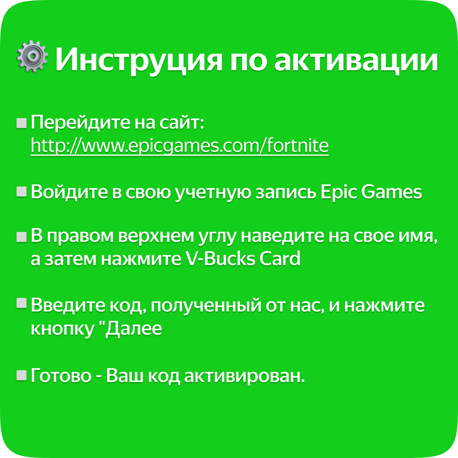 | Инструкция по активации | Чтобы обменять В-баксы, введите код на Fortnite/vbuckscard. Для использования кода V-Bucks требуется учетная запись Epic Games. После ввода кода на Fortnite/vbuckscard выберите платформу, на которой вы хотите использовать В-баксы. |