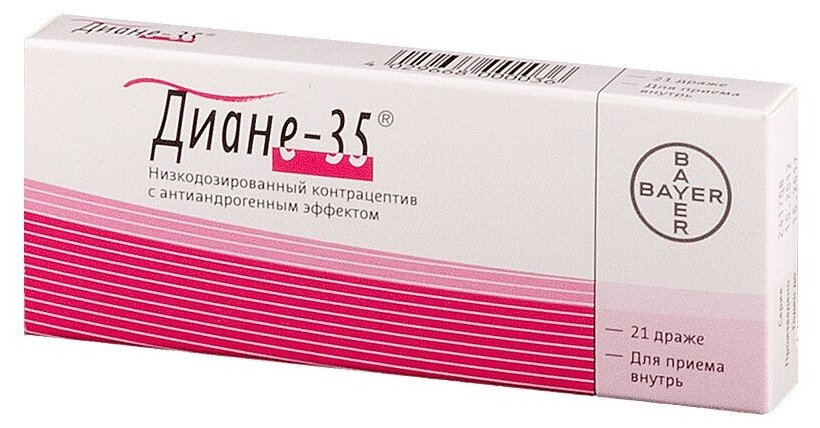 | Показания к применению | Лечение андрогензависимых форм акне средней степени тяжести и тяжелой степени (с себореей или без себореи) и/или гирсутизма у женщин репродуктивного возраста.Для лечения акне препарат Диане-35 следует применять только при неэффективности местной терапии или применения системных антибиотиков.Так как препарат обладает контрацептивным эффектом, он не должен применяться в сочетании с другими гормональными контрацептивными средствами. |