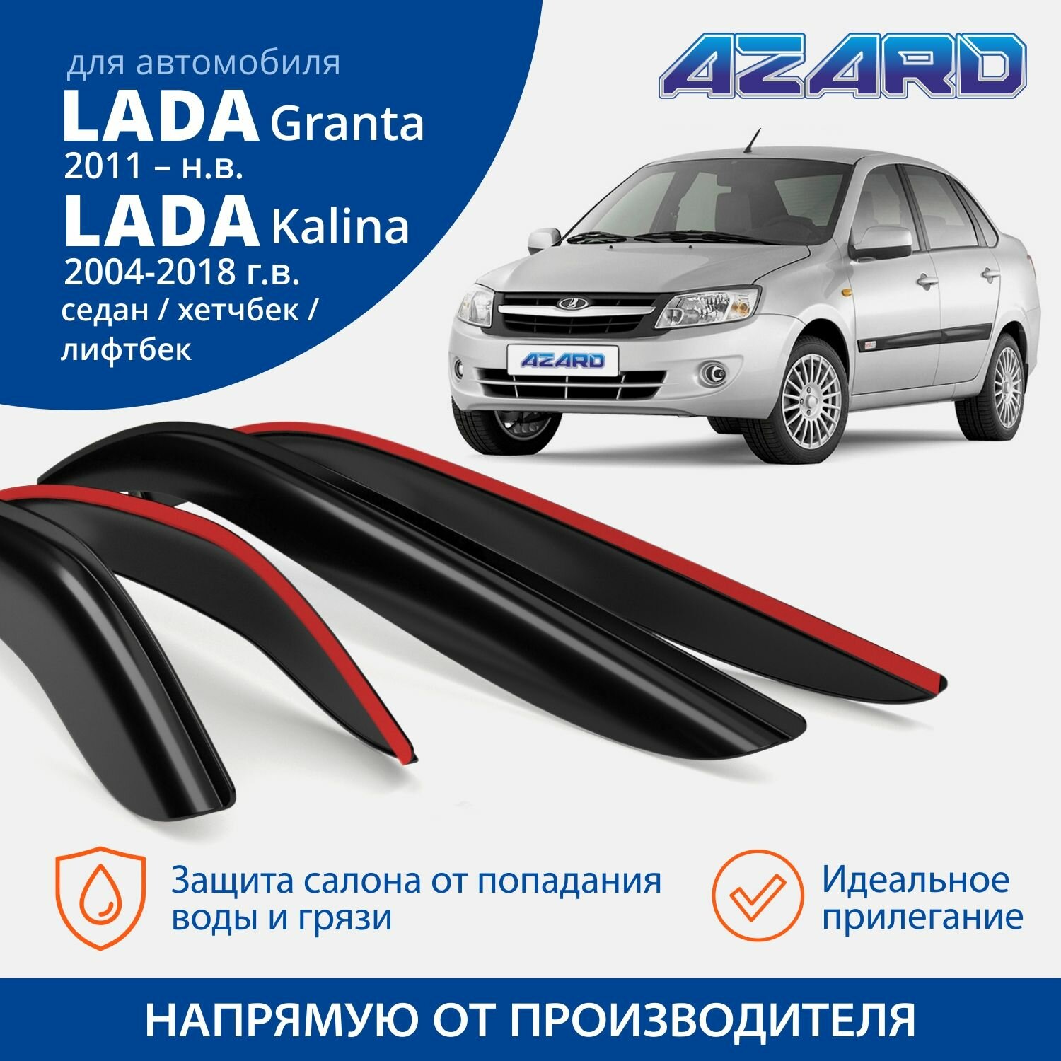 Дефлекторы окон /ветровики/ Azard для Lada / ВАЗ Kalina 2004-2018, Lada Granta 2011-н. в. седан хетчбек лифтбек накладные к-т 4шт