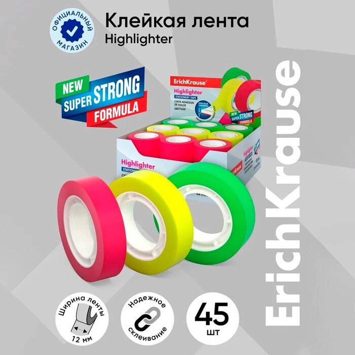 Клейкая лента канцелярская, 12 мм х 20 метра, ErichKrause "Highlighter", прозрачная, цветная, микс, цена за 1шт.