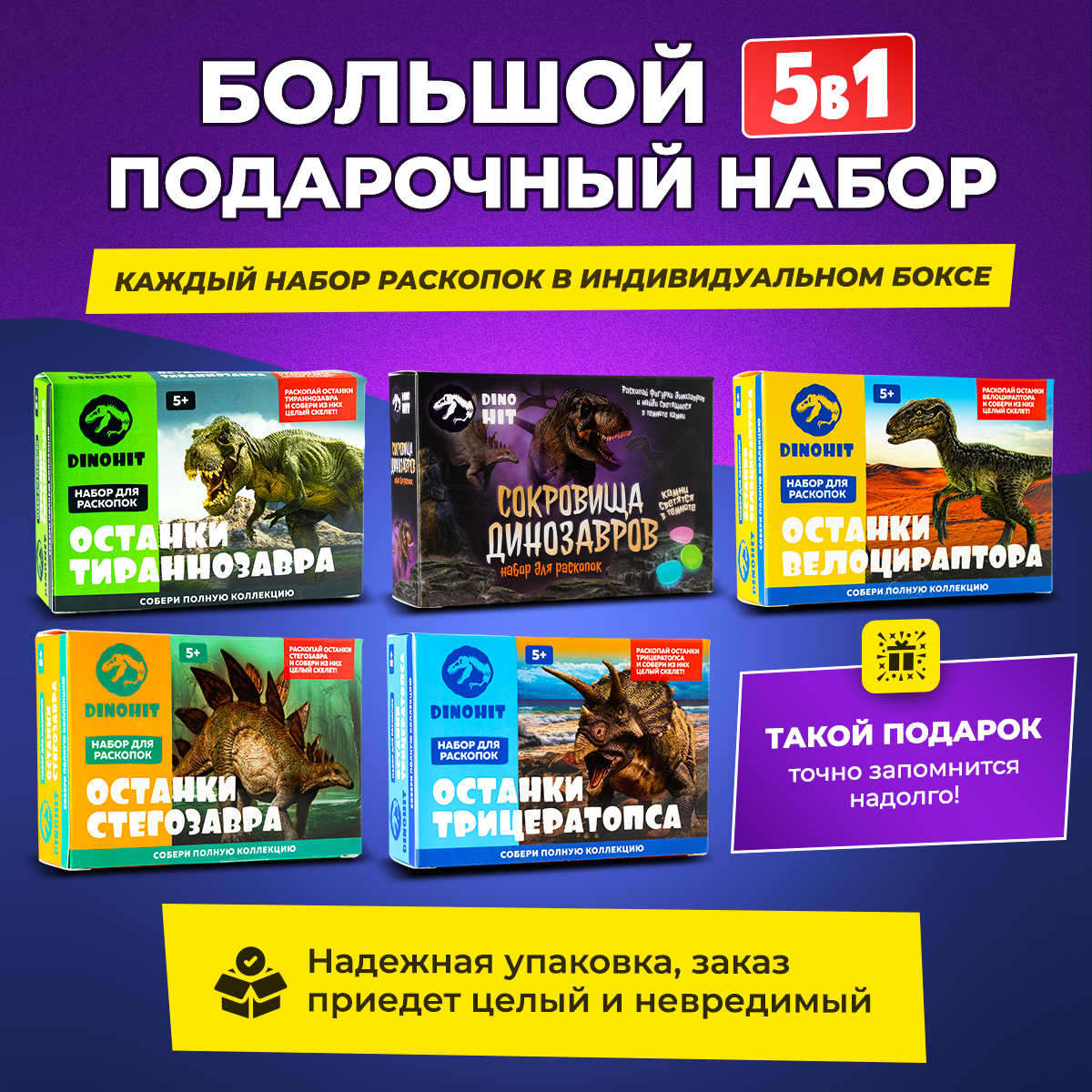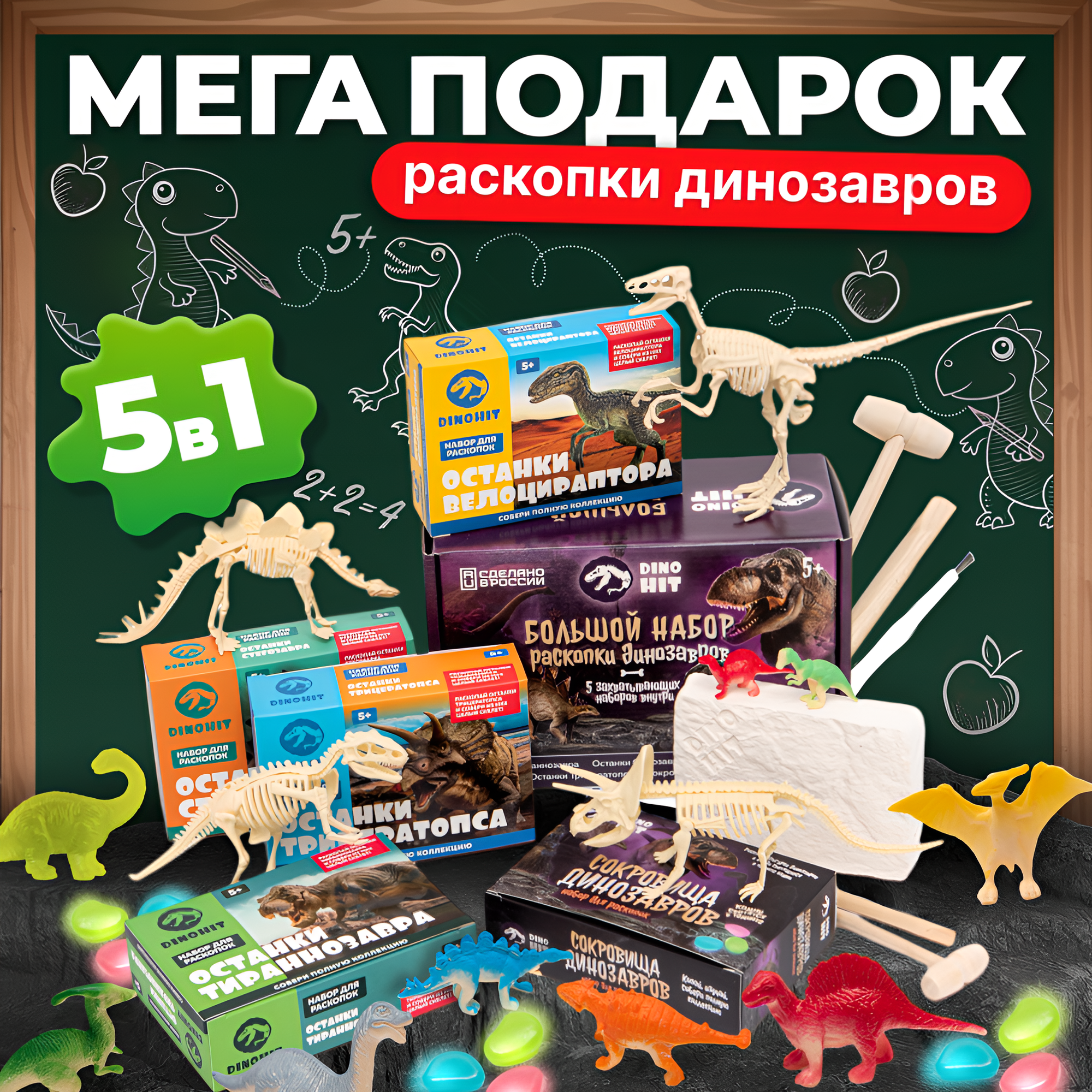 Раскопки динозавров 5 в 1 набор для детей DINOHIT / Опыты и эксперименты для мальчика и девочки от 5, 6, 7, 8, 9, 10, 11, 12 лет - идеальный подарок 1 730 ₽
