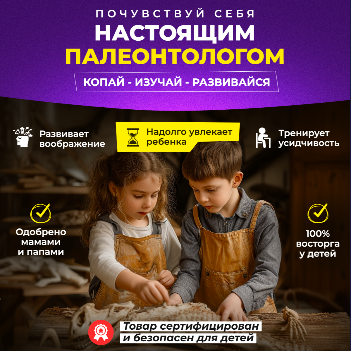 | Комплектация | Инструкция - 1 шт.; Гипсовый брусок со скелетом динозавра - 1 шт.; Деревянное долото - 1 шт.; Деревянный молоток - 1 шт.; Карточка с информацией - 1 шт. |