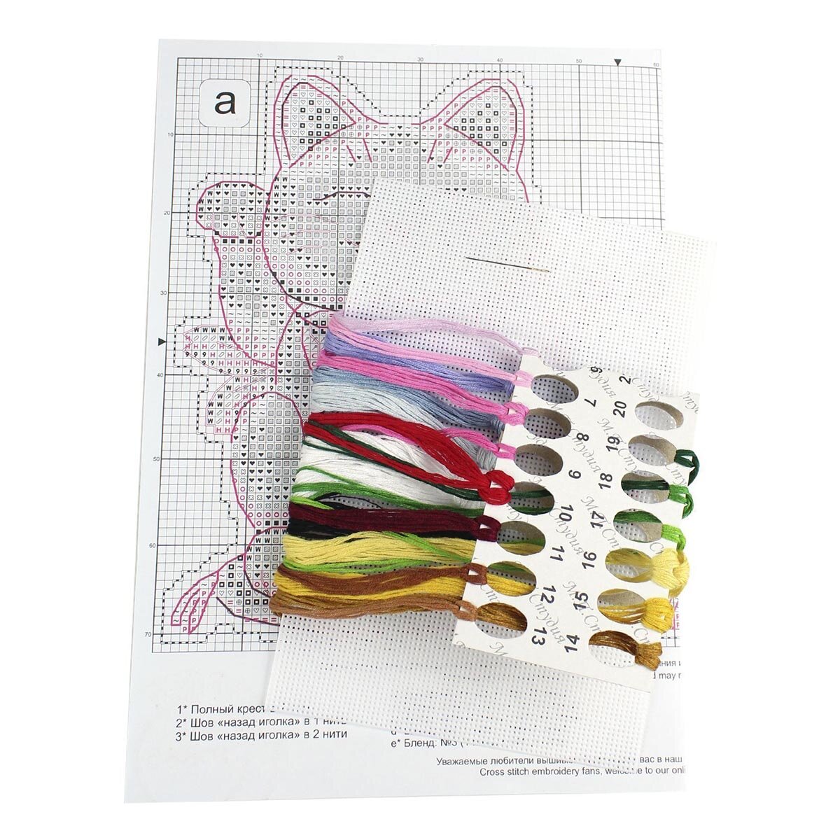 | Комплектация | Пластиковая канва, хлопковое мулине 19 цв., двухцветная символьная схема, игла, инструкция |