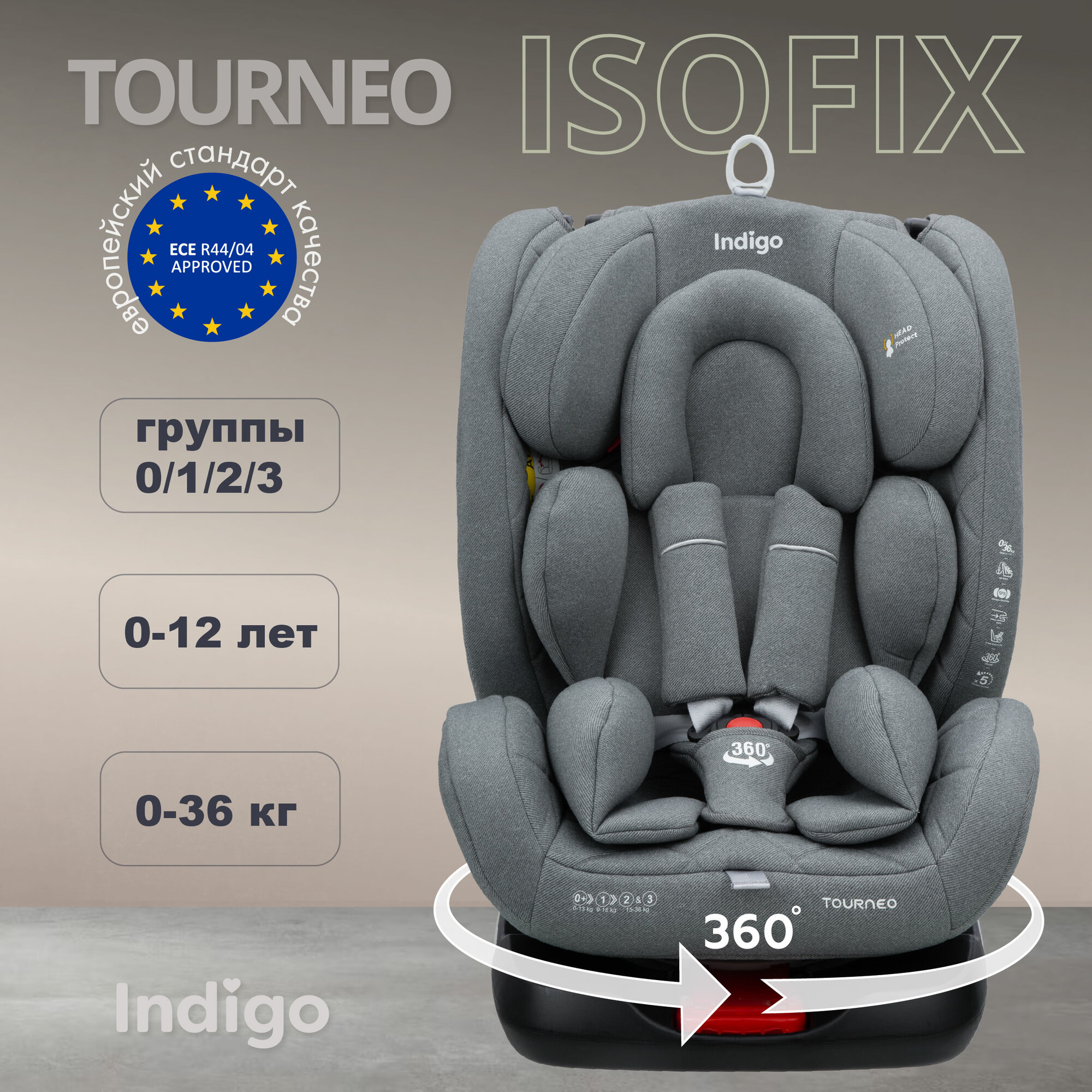 Автокресло Indigo Tourneo ISOFIX растущее поворотное, 0-36 кг, светло-серый информация: