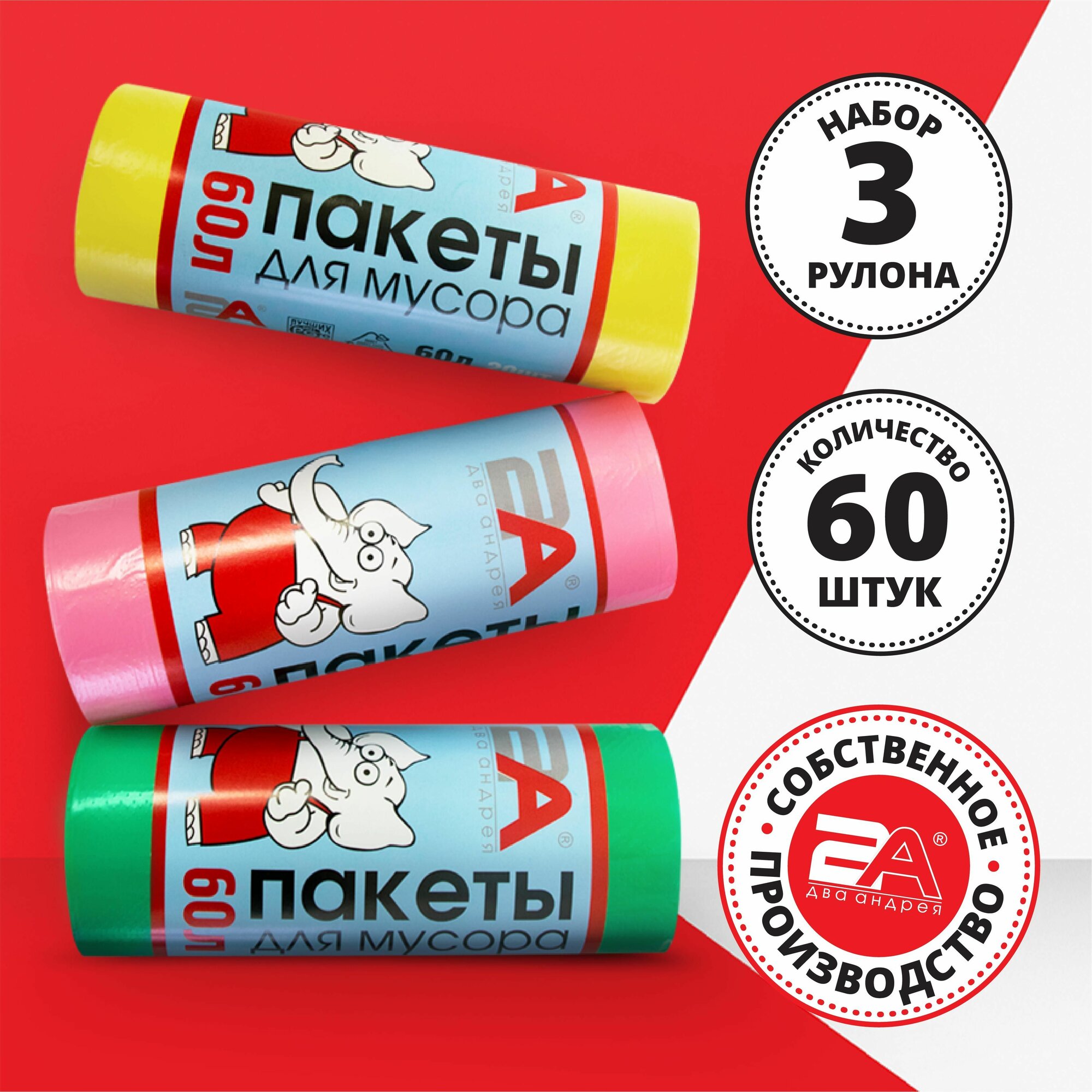 Пакеты для мусора 60 л прочные, мусорные мешки 60 л цветные, 3 рулона, 60 шт. информация: