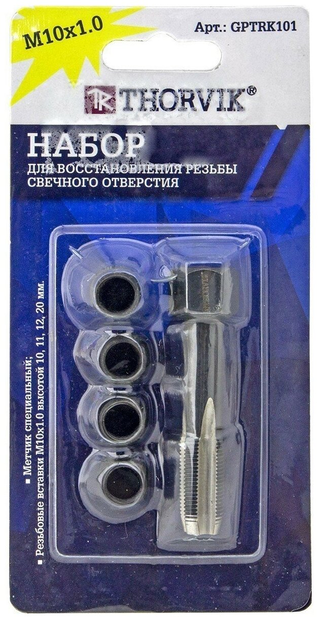 | Дополнительная информация | Набор для восстановления резьбы свечного отверстия М10х1.0, 5 предметов Thorvik |