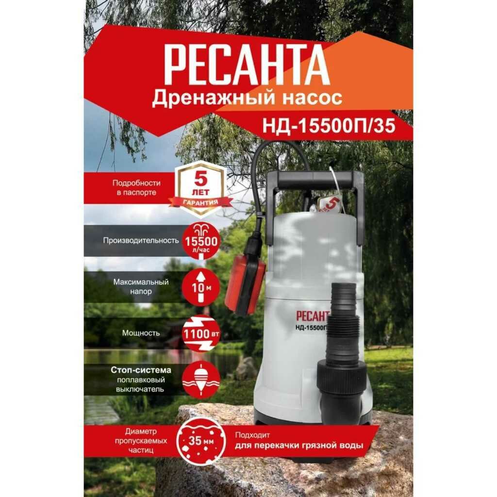 Насос дренажный погружной РЕСАНТА НД-15500П/35 для грязной воды (258 л/мин, с поплавковым выключателем) для откачки воды из водоемов, шахт, подвалов, помещений, бассейнов / для дома и дачи информация: