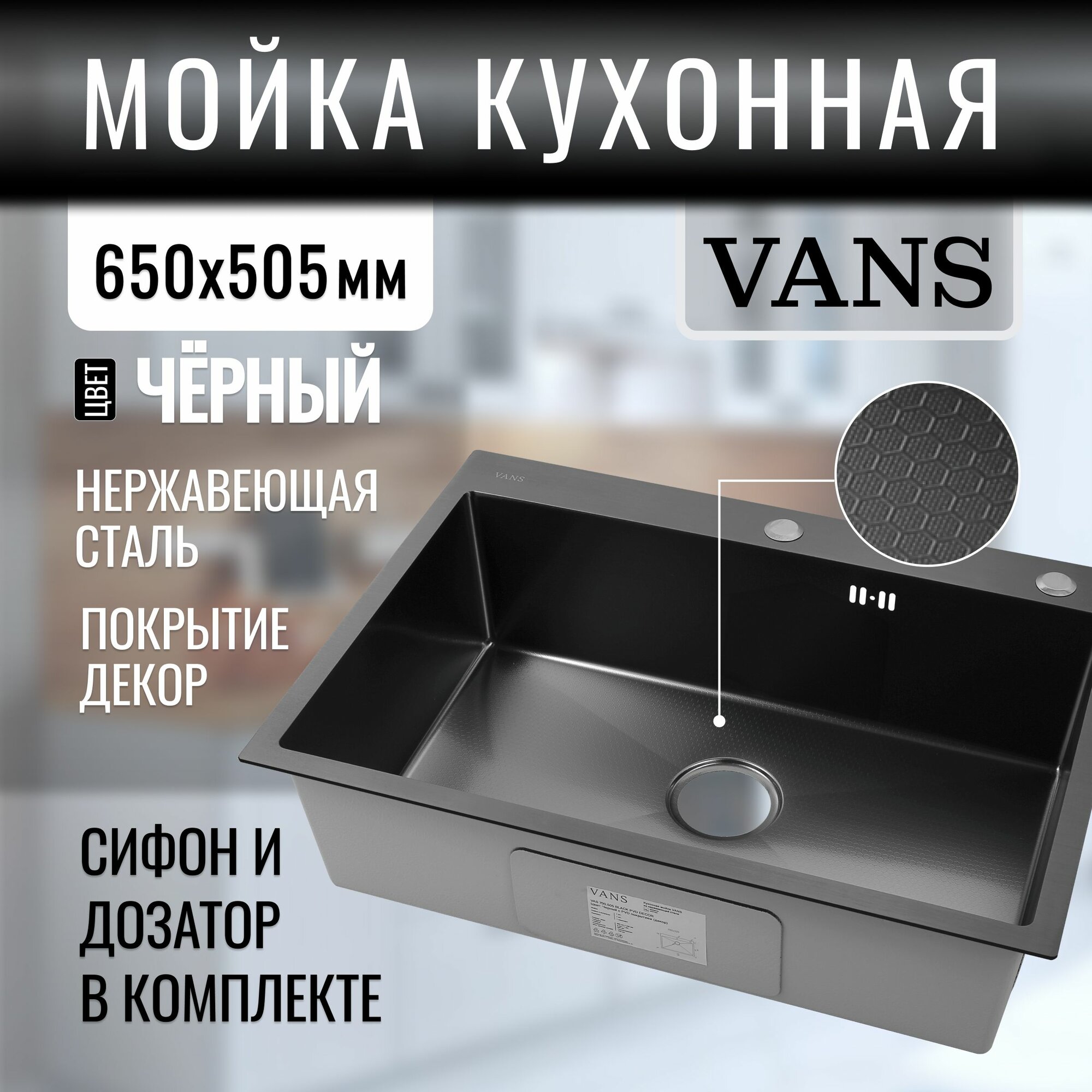 Кухонная мойка из нержавеющей стали "VANS" 650*505*200 мм Black DECOR информация: