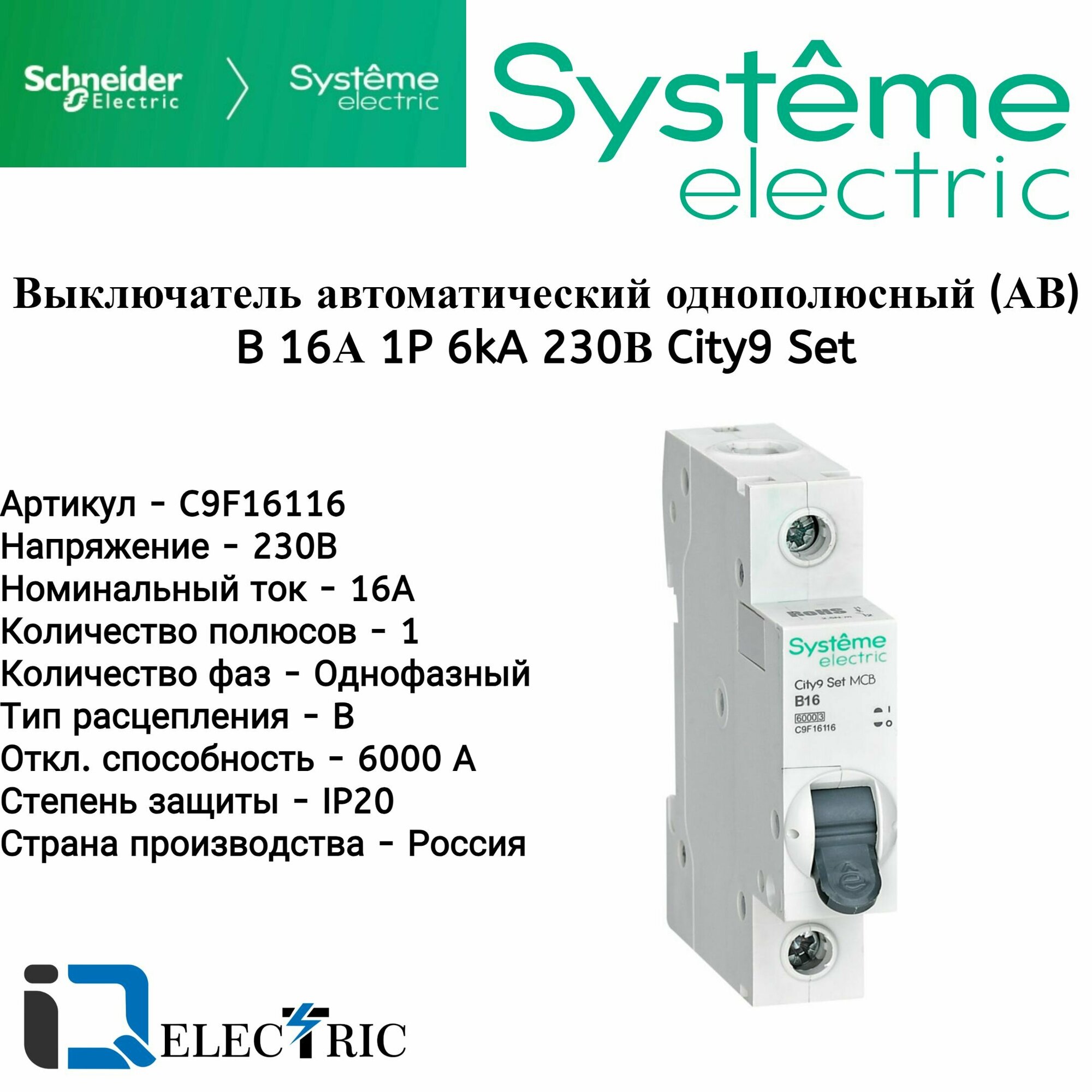 Systeme Electric City9 Set Автоматический выключатель (АВ) B 16А 1P 6kA 230В 776 ₽