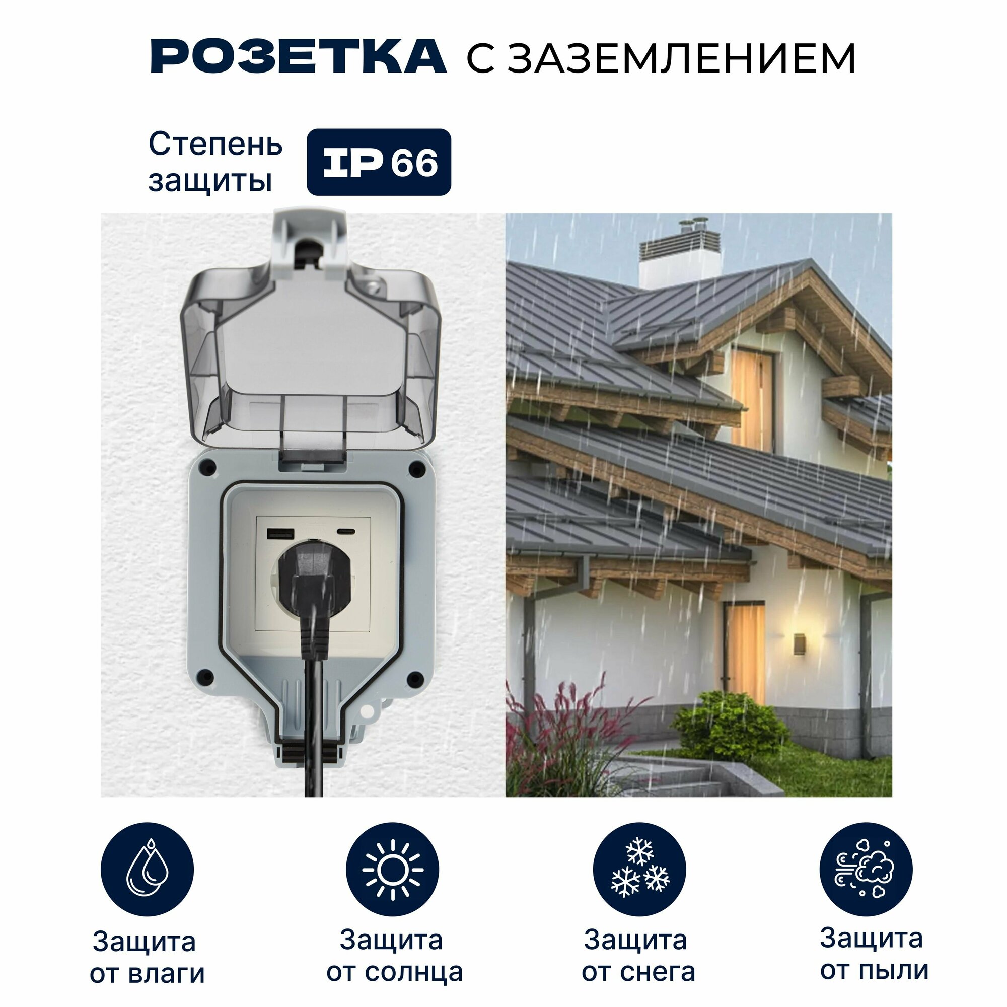 Розетка уличная с USB+C IP66 влагозащищенная, садовая, наружная с крышкой, электророзетка накладная с заземлением 16А информация: