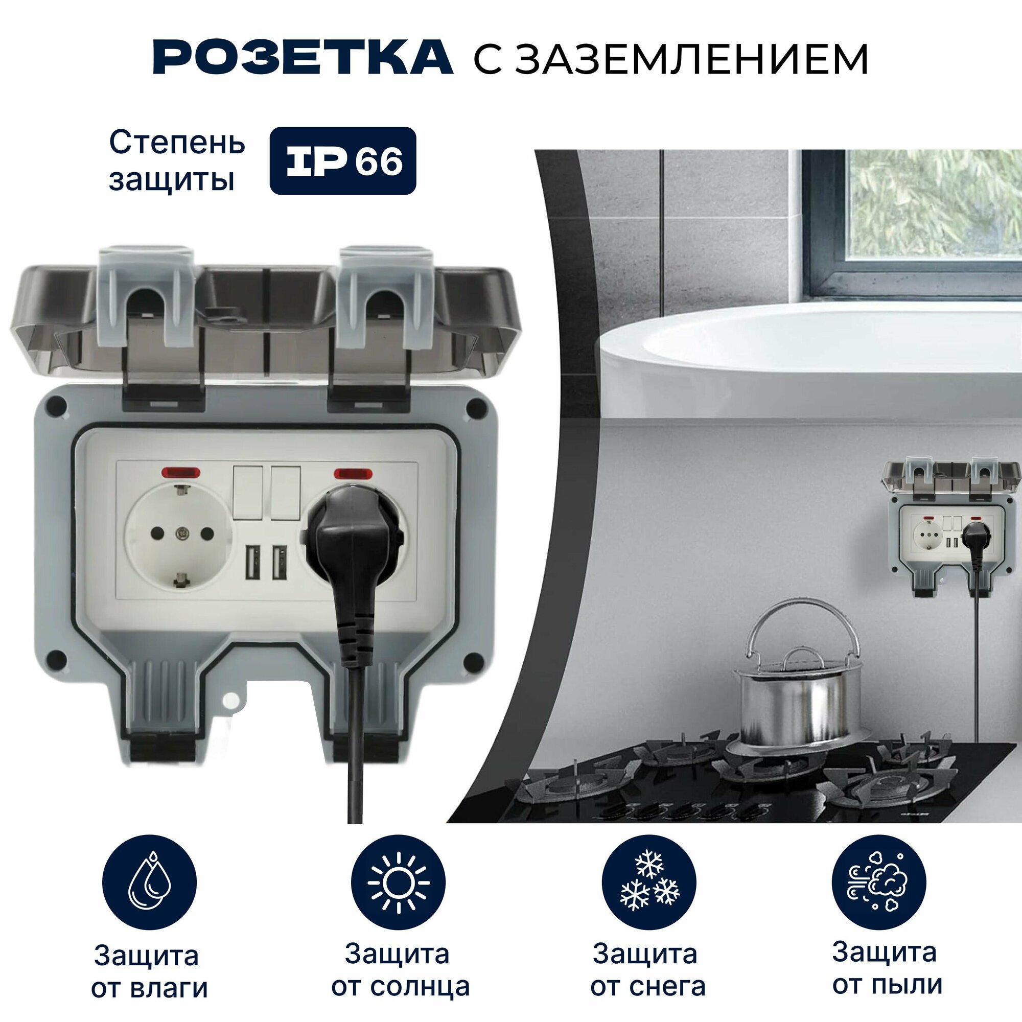 Розетка уличная USB IP66 двойная влагозащищенная, садовая, наружная с крышкой, электророзетка накладная с заземлением информация:
