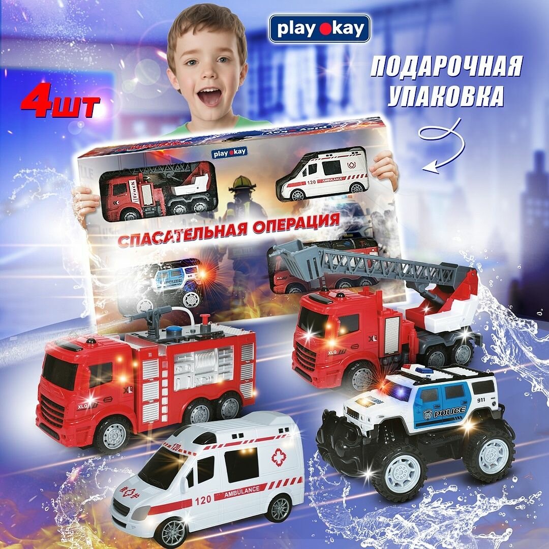 10 цен на Игровой набор машинок Play Okay спасательная спецтехнкика для детей, пожарная машина и полиция, инерционные, 4 шт