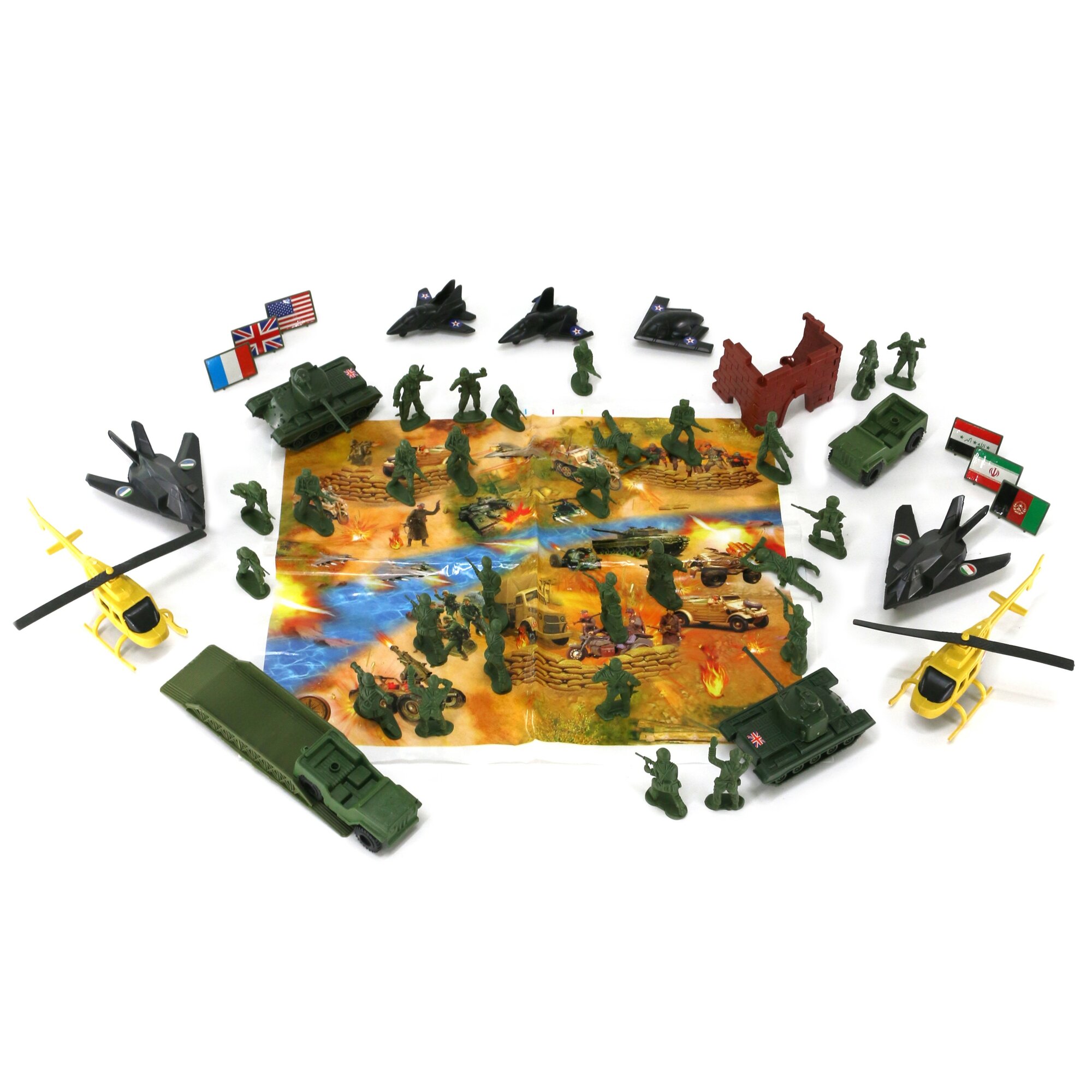 | Комплектация | фигурки военных, вертолеты-2 штуки, самолеты-2 штуки, военные машины-2 штуки, танка-2 штуки, истребители-2 штуки, карта |