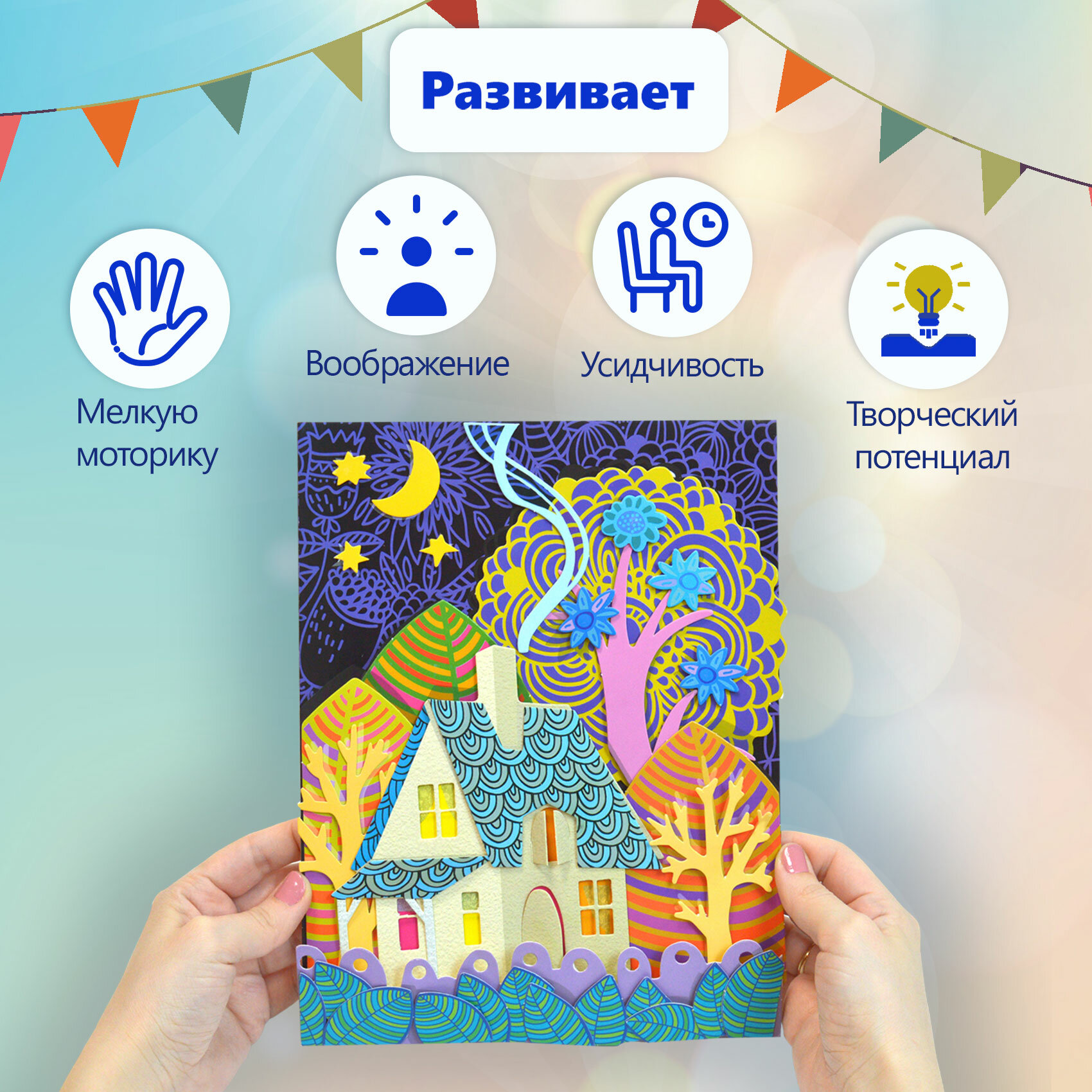 | Комплектация | - цветная основа с рисунком и схемой размещения деталей; - детали, вырубленные из цветного картона; - объёмный двусторонний скотч; - цветная листовка-образец. |