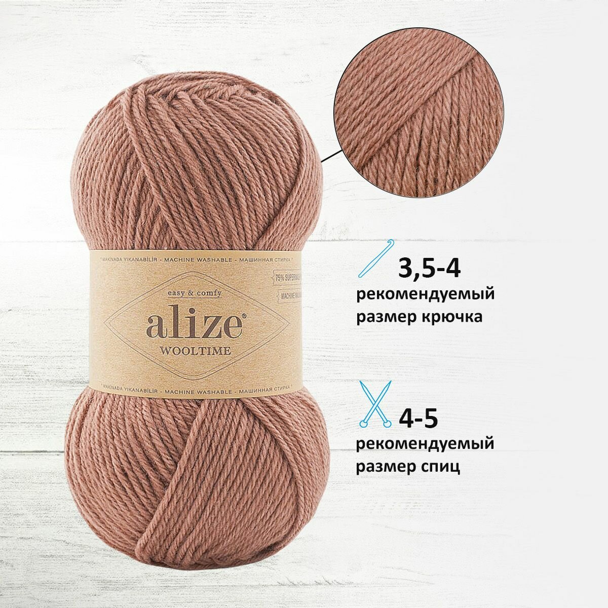 Пряжа для вязания ALIZE 'Wooltime', 100г, 200м (75% SW шерсть, 25% полиамид) (581 розовый шоколад), 5 мотков 2 256 ₽