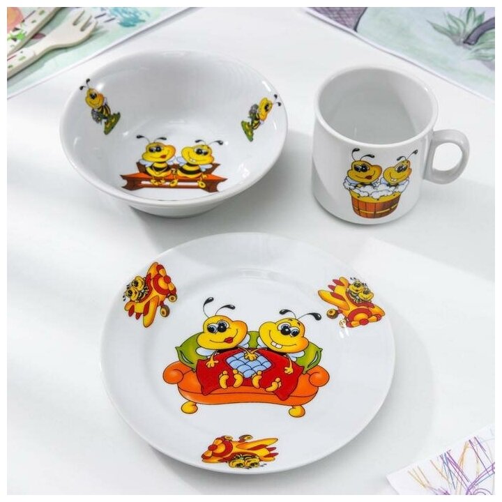 Набор посуды «Пчёлы», 3 предмета: кружка 200 мл, салатник 350 мл, тарелка мелкая d=16,5 см, рисунок микс