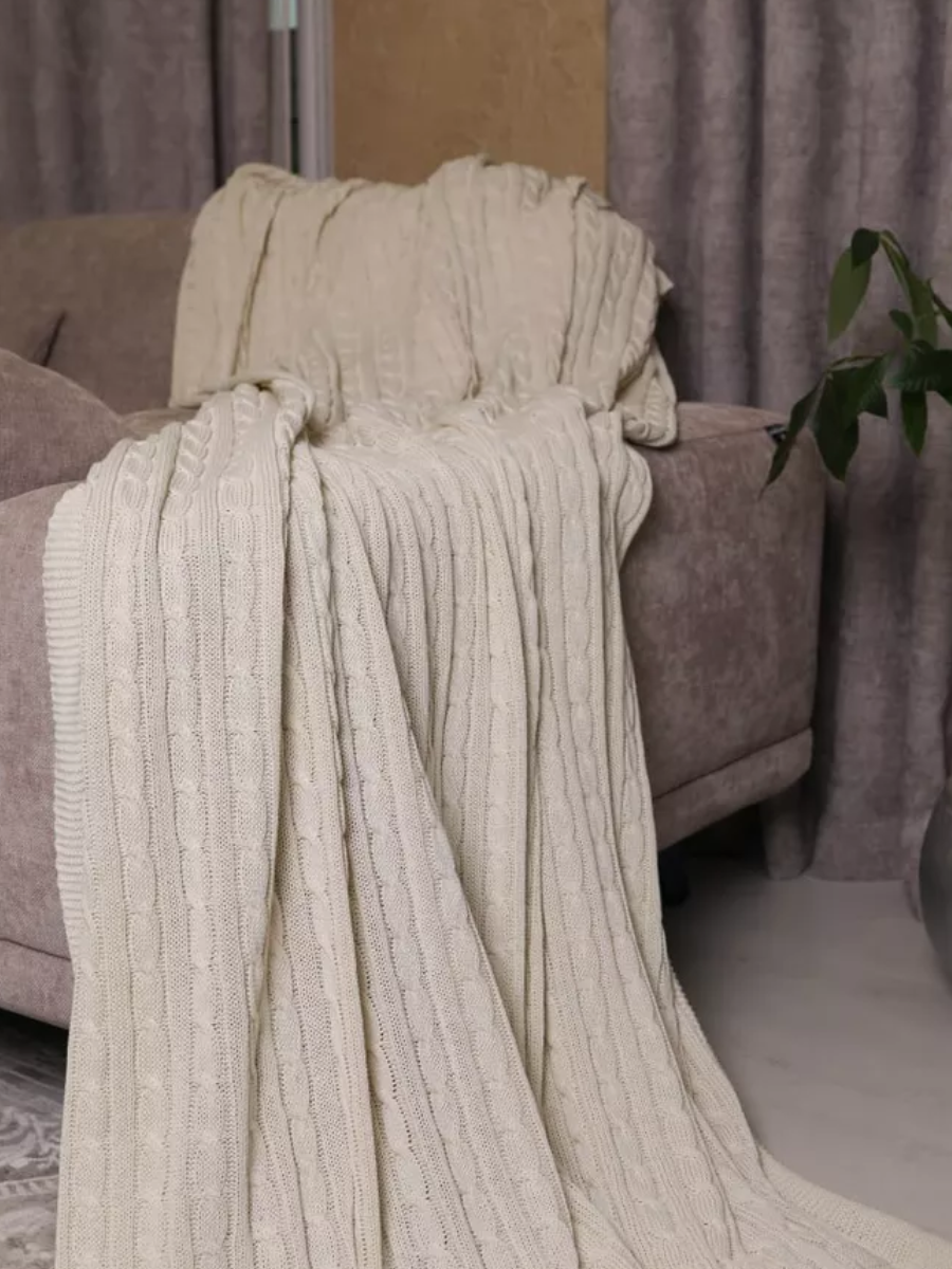 Вязаный плед из 100% хлопка, 180х220 см, бежевый 3 855 ₽