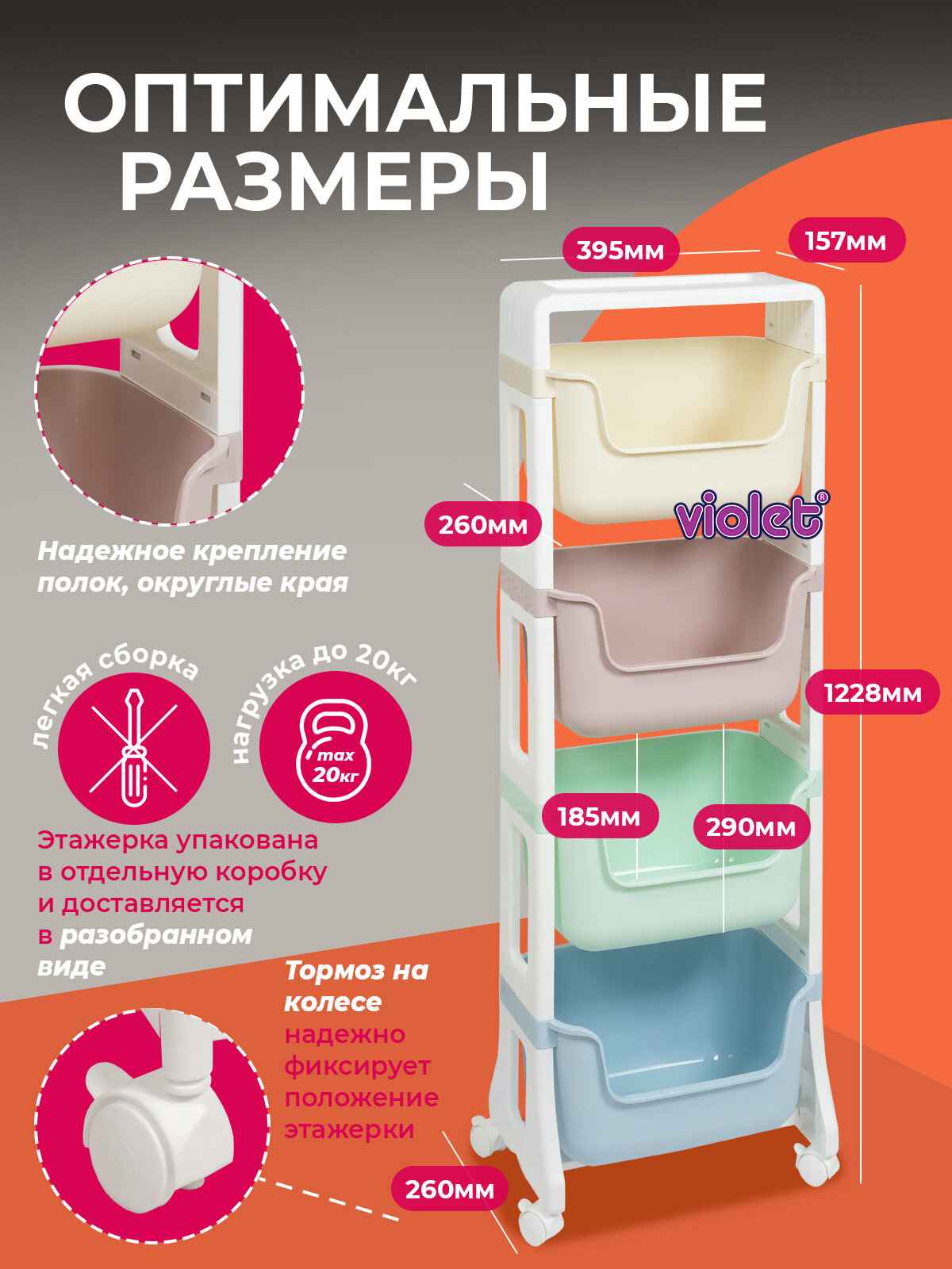 Этажерка на колесах Violet Junior, 4 корзины, 395 x 260 x 1228 мм, пластик, латте/слоновая кость 3 257 ₽