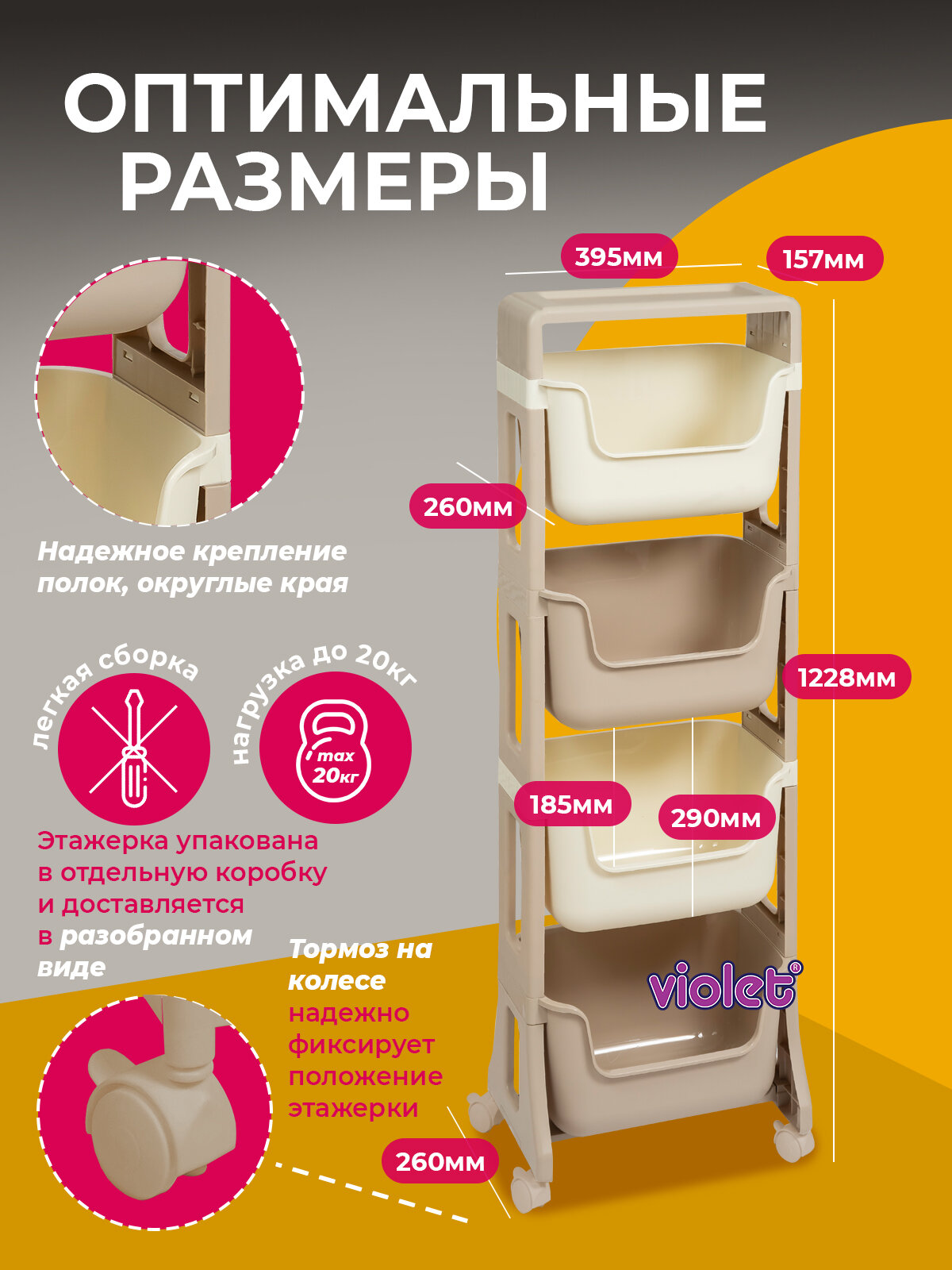 Этажерка на колесах Violet Junior, 4 корзины, 395 x 260 x 1228 мм, пластик, латте/слоновая кость 3 257 ₽