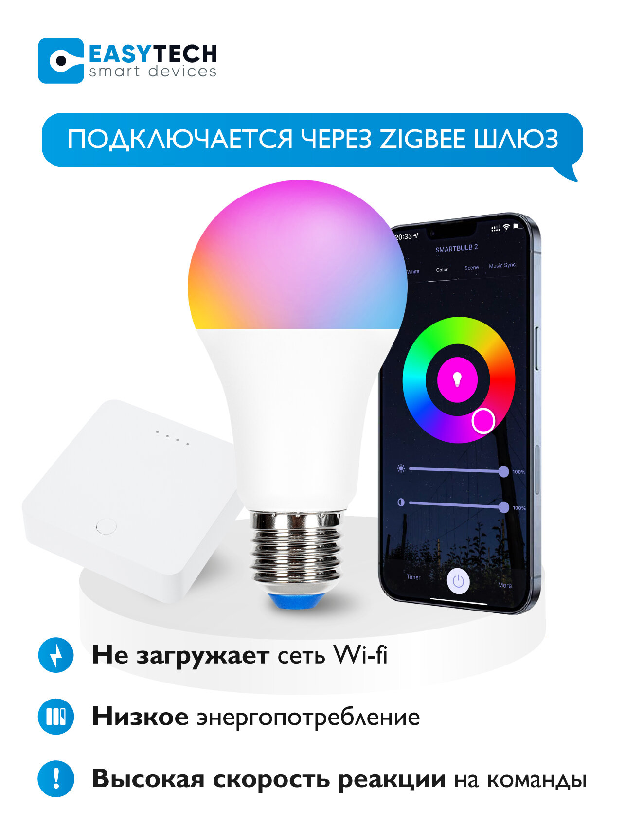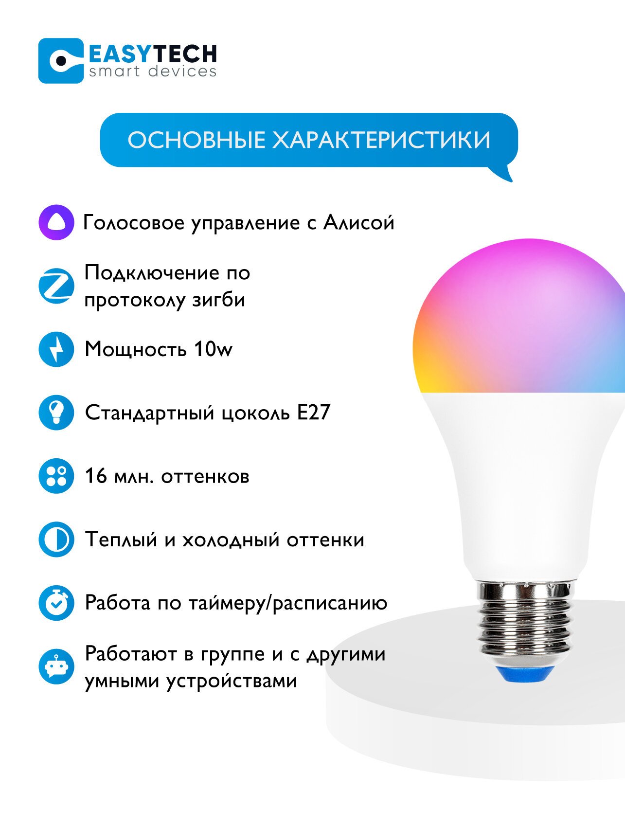 Умная светодиодная лампочка Easy Tech - ZigBee, RGB, 10W, E27, работает с Алисой, Smart Bulb информация: