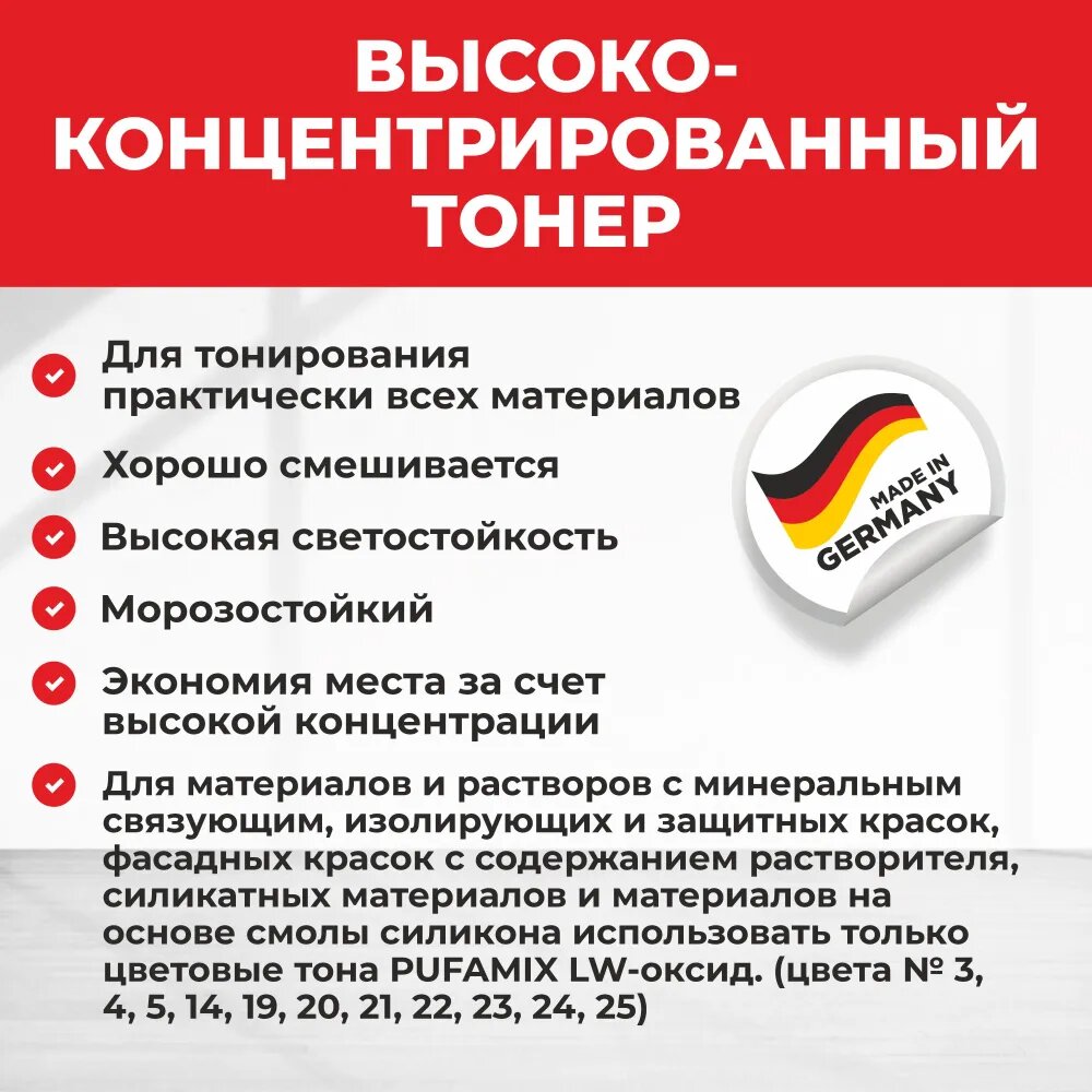 | Дополнительная информация | Перед использованием флакон хорошо встряхнуть. Пуфамикс добавить в предназначенный для тонирования материал и хорошо перемешать до образования однородной консистенции. Для тонирования лаков рекомендуется применять смешивающее устройство. Перед смешиванием с материалами на основе растворителей, провести пробу на совместимость. |