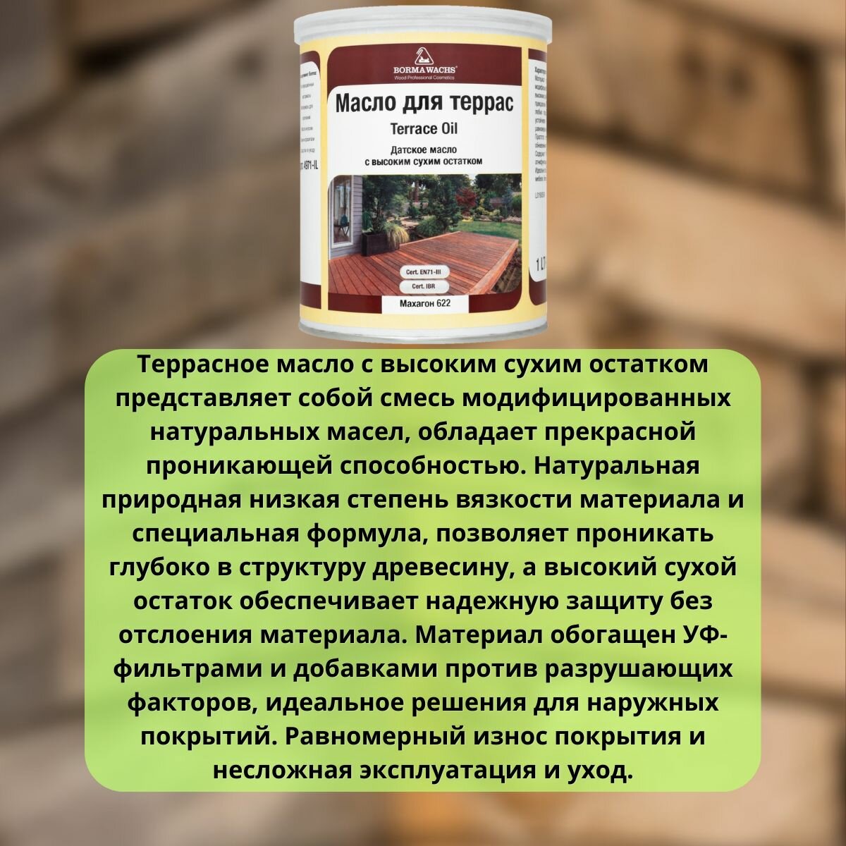Масло для дерева BORMA WACHS Terrace Oil , Цветное масло для террас , Датское с высоким сухим остатком, Цвет 173 ТИК 0,125мл 920 ₽