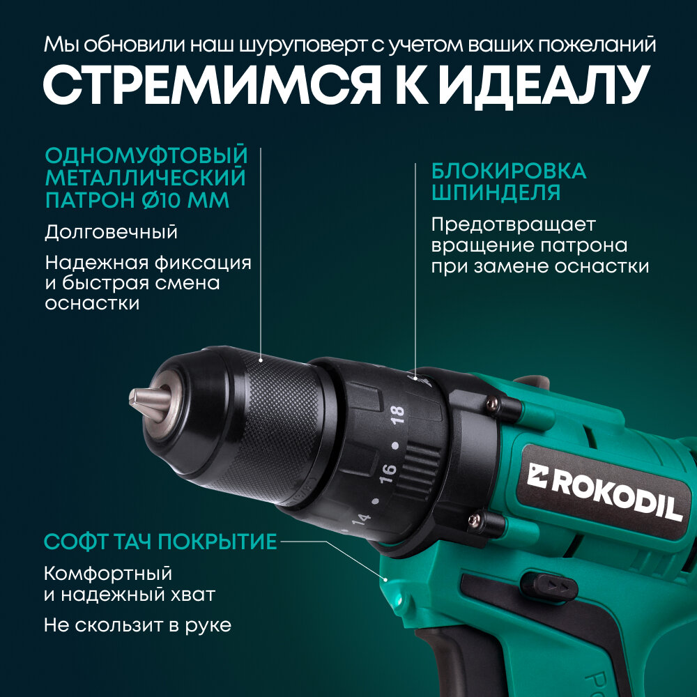 Дрель-шуруповерт аккумуляторная ROKODIL Twist 2 Pro, 18 В, 2 Ач, 48 н/м